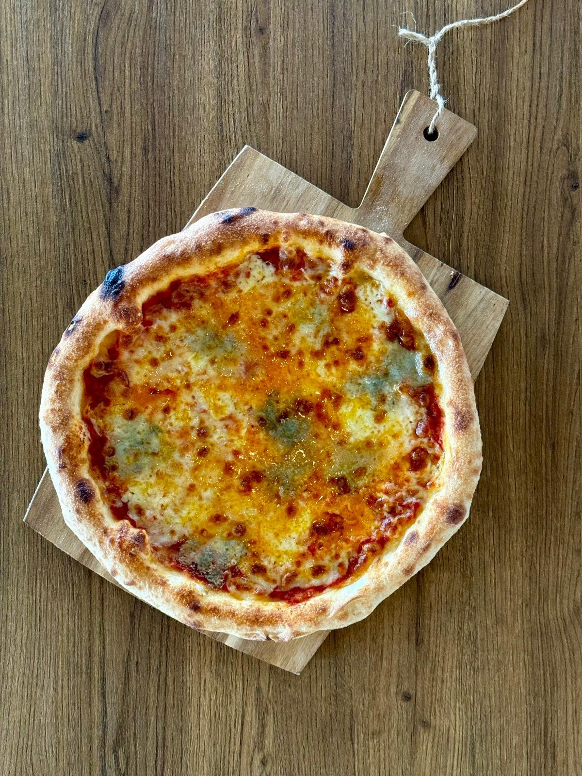 Pizza base topped off with a rich tomato sauce, shredded mozzarella, Italian Gorgonzola, mature cheddar cheese cooked to perfection and finished off with grana shavings