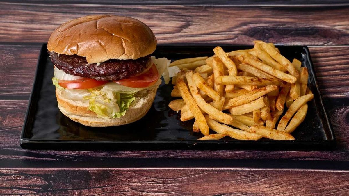 Served on a brioche bun, crisp lettuce sliced tomatoes and raw onions and fries