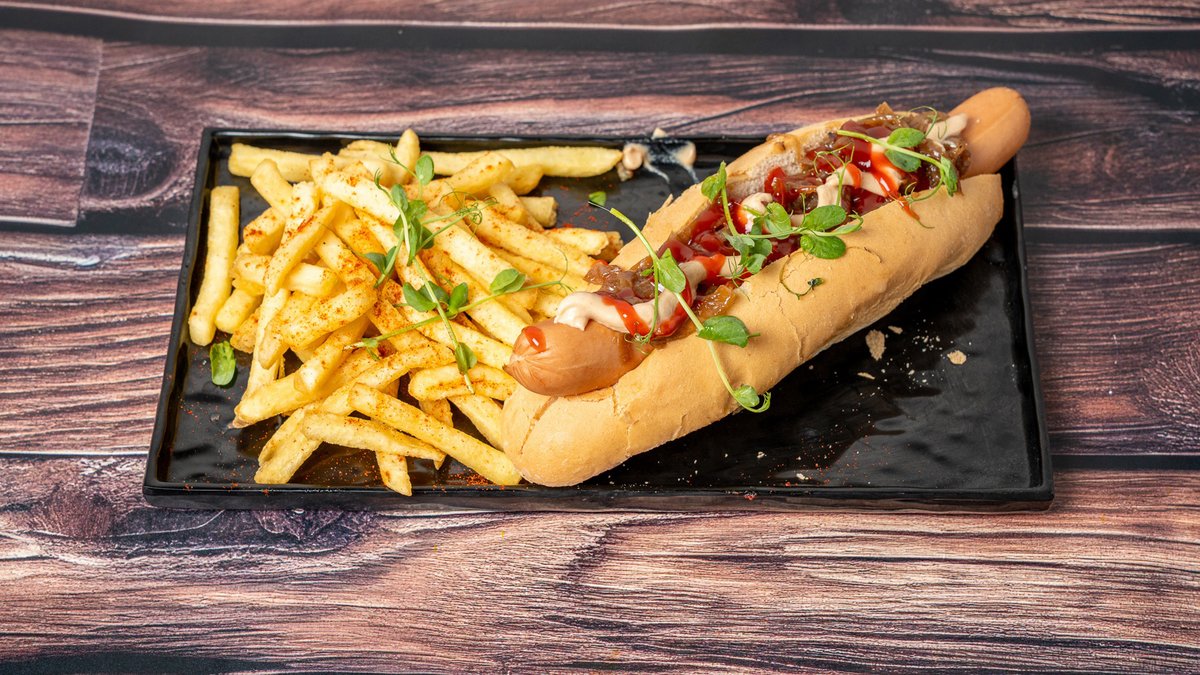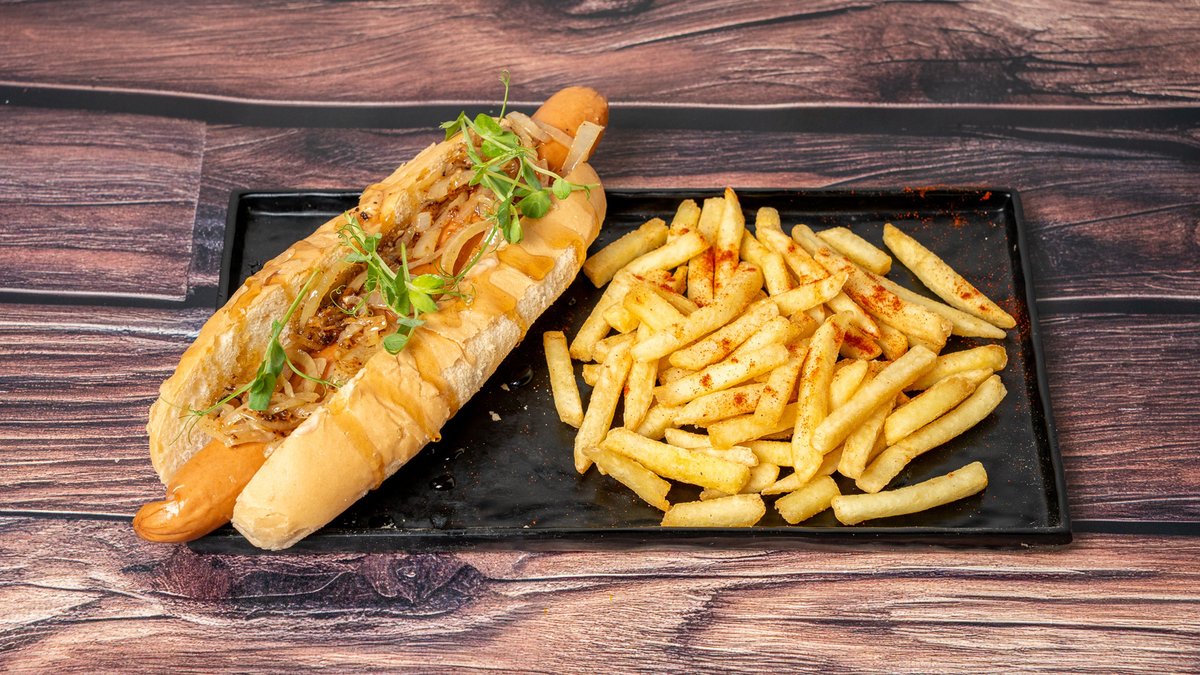 Classic bratwurst sausage topped with caramelized onions, finished off with tomato ketchup and American mustard.