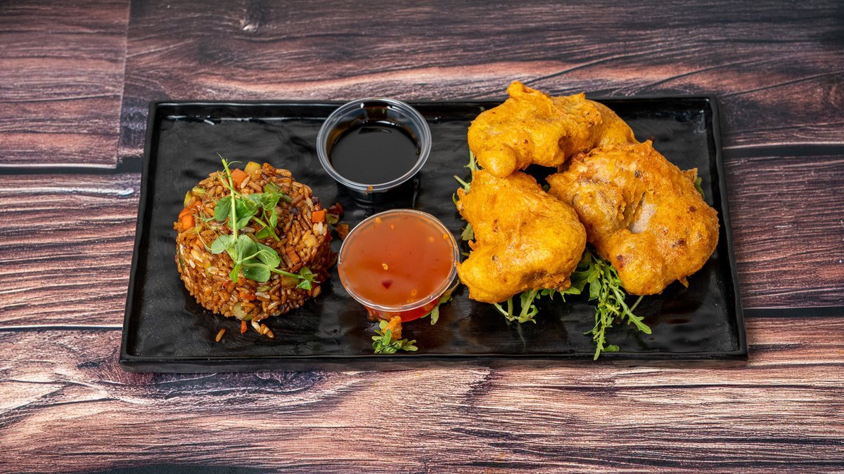 Double fried marinated spicy chicken thighs in batter served with a side of spicy vegetable rice. Condiments: soya sauce, sweet chilli sauce.