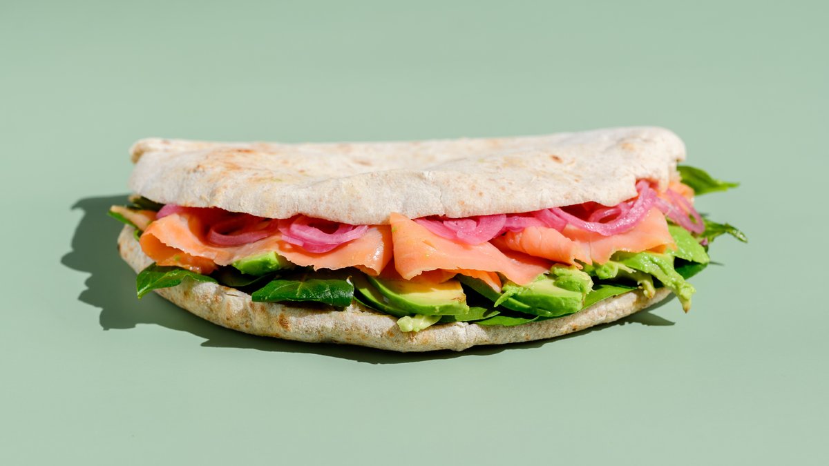 Smoked Salmon, avocado, pickled red onion, spinach, dill and lemon sauce, in a freshly baked homemade wholemeal bread Kcal447.2, Protein21.5, Carbs63.9, Fiber17.2, Fats11.2 Contains Gluten, Fish, Milk