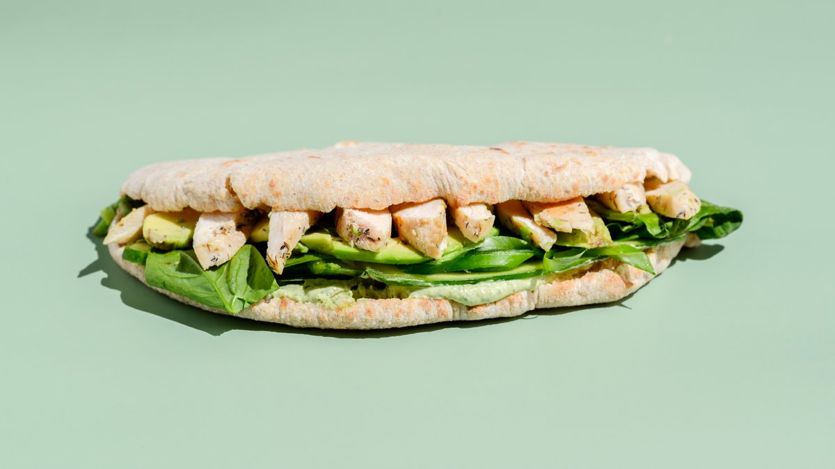Chicken, avocado, spring onion, spinach, cucumber and yoghurt sauce, in a freshly baked homemade wholemeal bread Kcal487.5, Protein30.6, Carbs64, Fiber17.4, Fats11.5 Contains Gluten, Milk