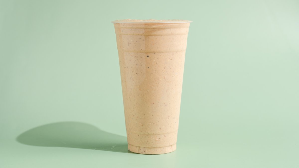 Banana, peanut butter, cocoa powder, Greek yoghurt, and almond milk Kcal474, Protein17.6, Carbs38, Fiber12, Fats28 Contains Milk, Nuts