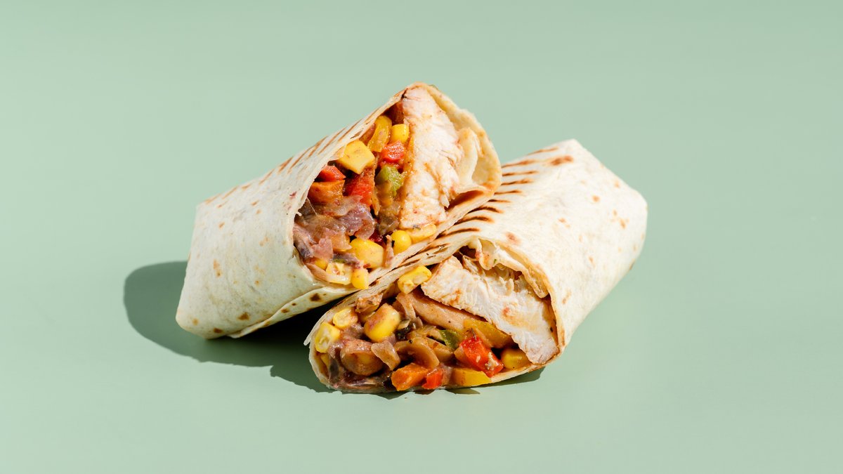 Grilled chicken, mixed peppers, onions, mushrooms, refried beans and sweet corn, wrapped in a wholegrain wrap Kcal556, Protein39, Carbs60, Fiber10, Fats22
