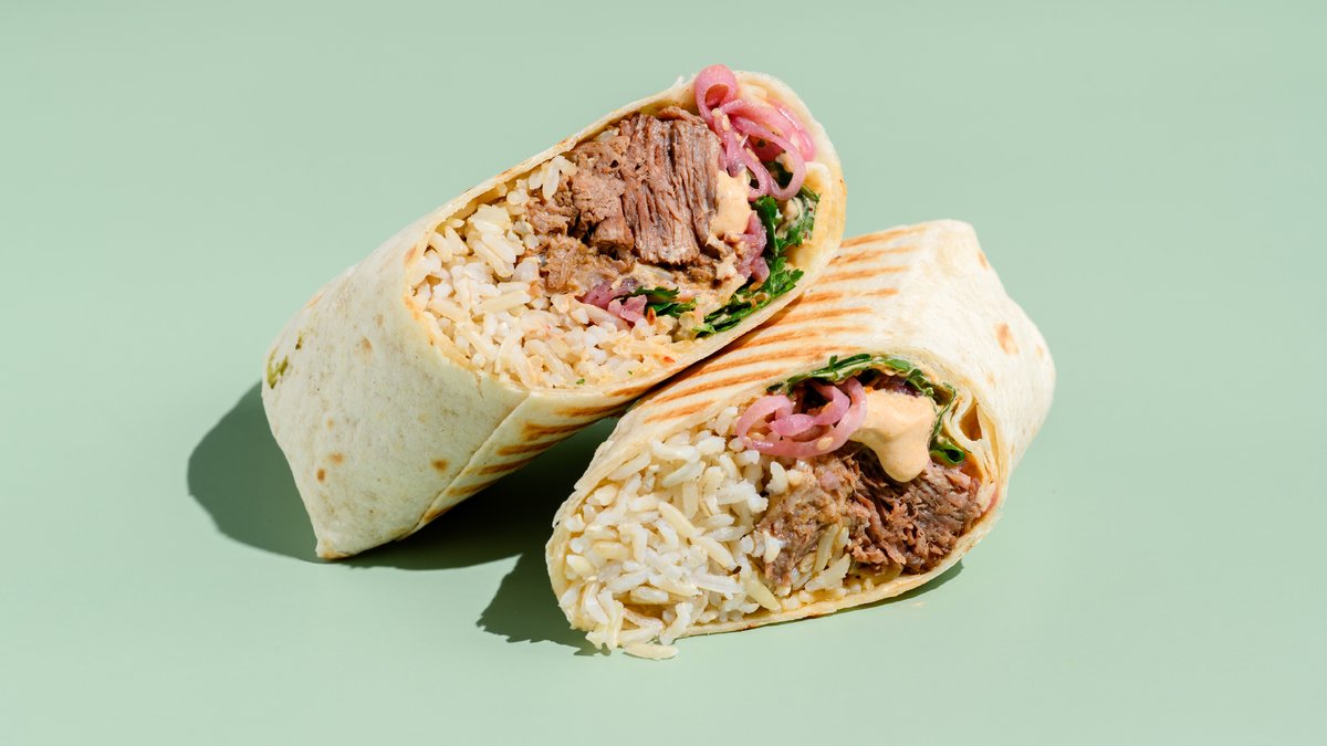 Slow-cooked pulled beef, sticky brown rice, crunchy cabbage and carrot slaw, pickled red onion, cucumber, chilli yoghurt sauce, toasted sesame seeds, fresh herbs, wrapped in a wholegrain wrap Kcal547, Protein26, Carbs68, Fiber7, Fats19 wrap