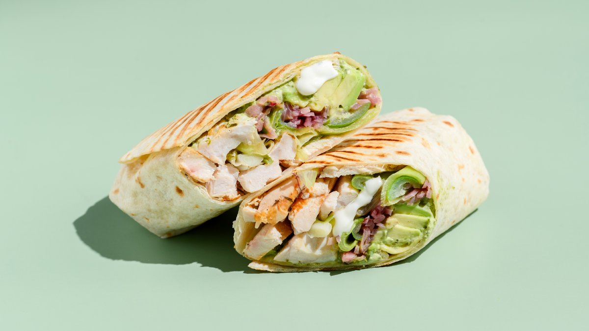 Turkey breast, spring onions, cucumber, pickled red onions, avocado, green goddess yoghurt sauce, wrapped in a wholegrain wrap Kcal514, Protein42, Carbs51, Fiber7, Fats16