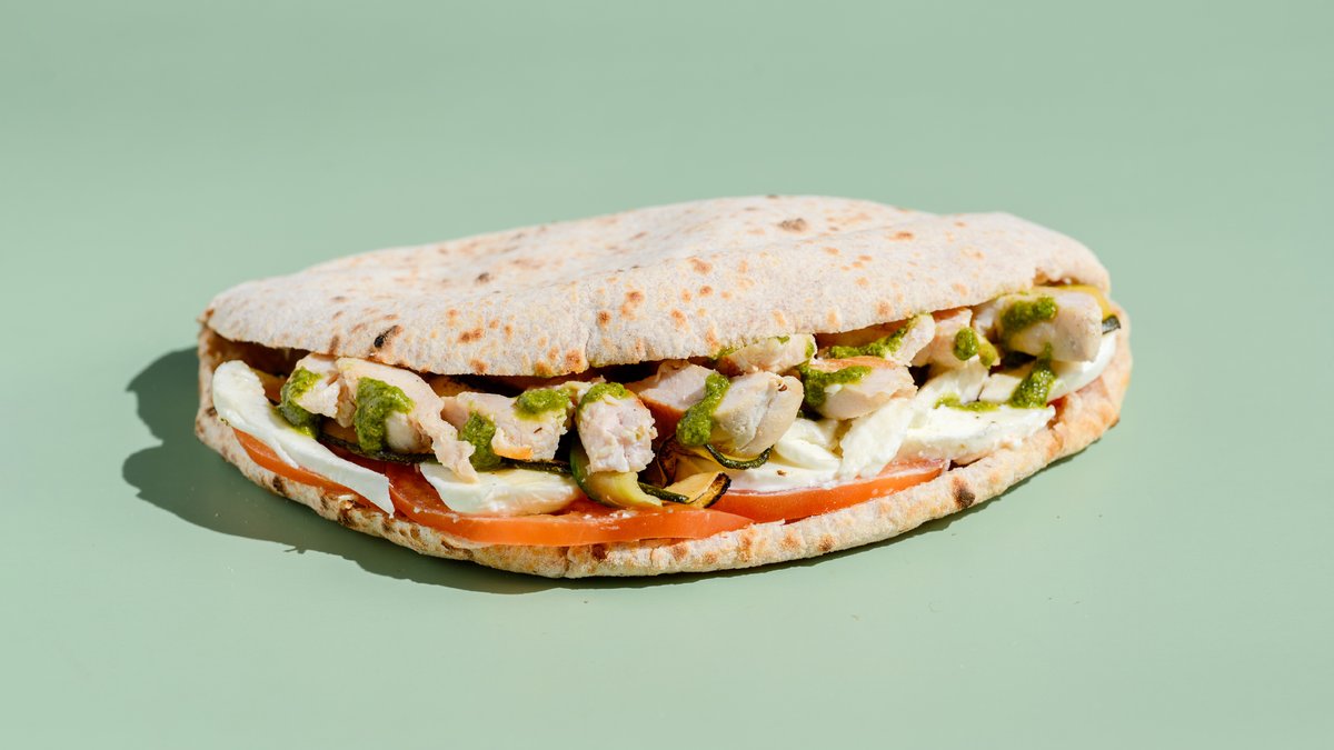 Mozzarella fior di latte, turkey, sunflower seed pesto, grilled zucchini, tomatoes, in a freshly baked homemade wholemeal bread Kcal548.5, Protein32.8, Carbs61.4, Fiber15.4, Fats18.2 Contains Gluten, Milk, Nuts