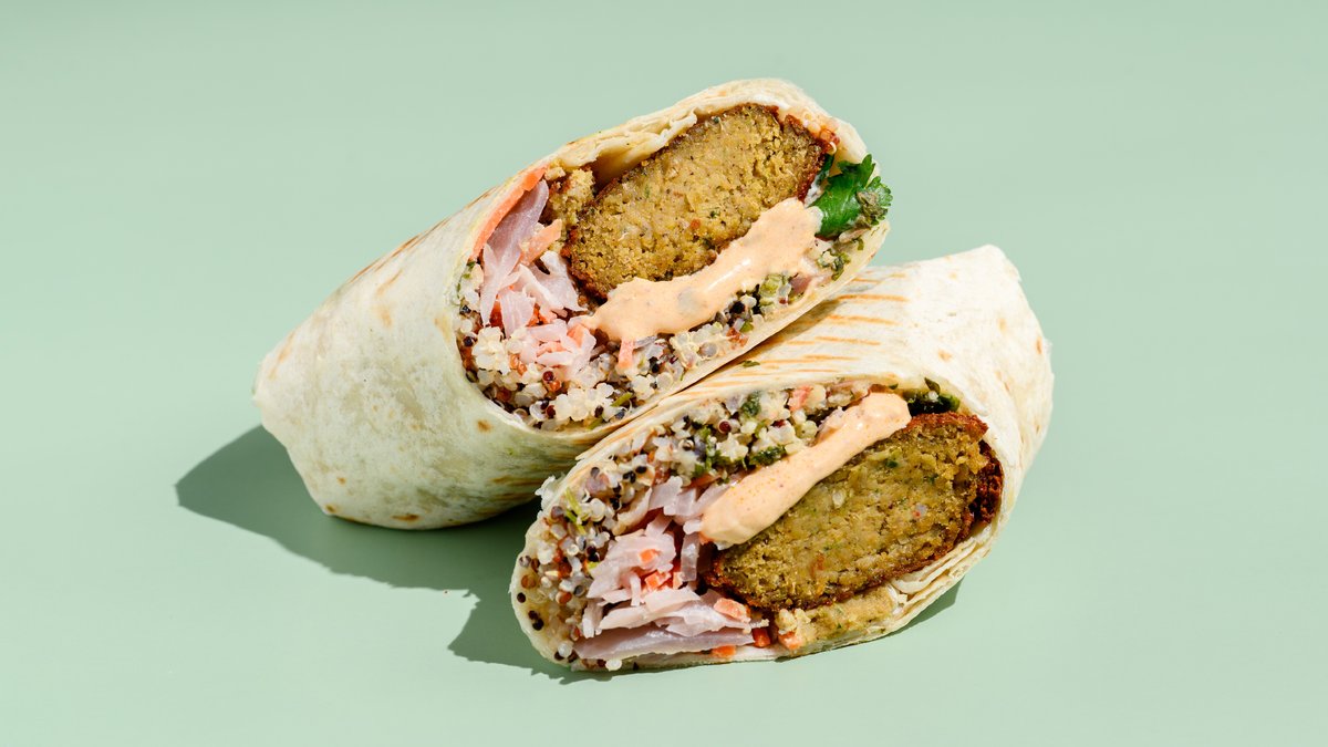 Falafel, pickled vegetables, quinoa, tabouleh, tahini, and garlic yoghurt sauce, wrapped in a wholegrain wrap Kcal727, Protein32, Carbs87, Fiber25, Fats30
