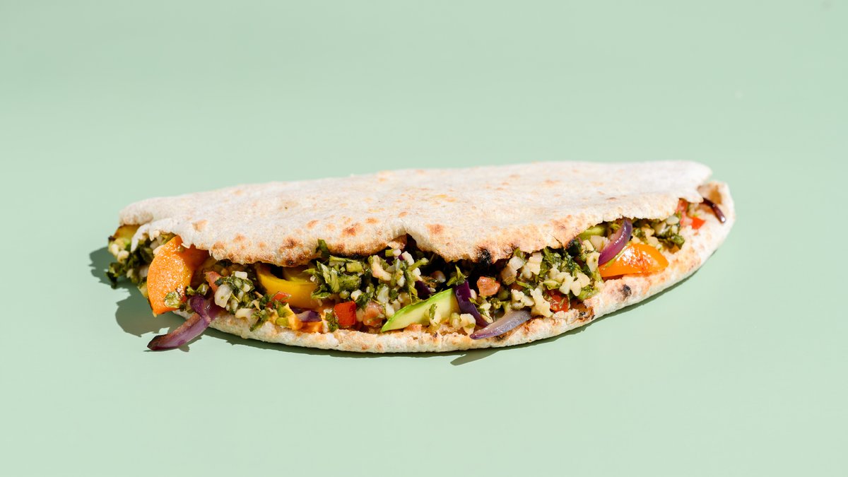 Chargrilled vegetables, red pepper hummus, tabbouleh with a tahini lemon sauce, in a freshly baked homemade wholemeal bread Kcal550, Protein17.6, Carbs80.2, Fiber20.8, Fats22 Contains Gluten, Sesame