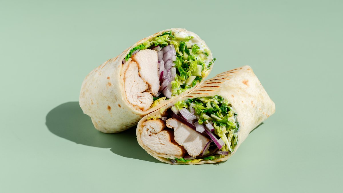 Grilled chicken with tzatziki, red onions, cucumber, savoy cabbage, wrapped in a wholegrain wrap Kcal378, Protein28, Carbs41, Fiber9, Fats10