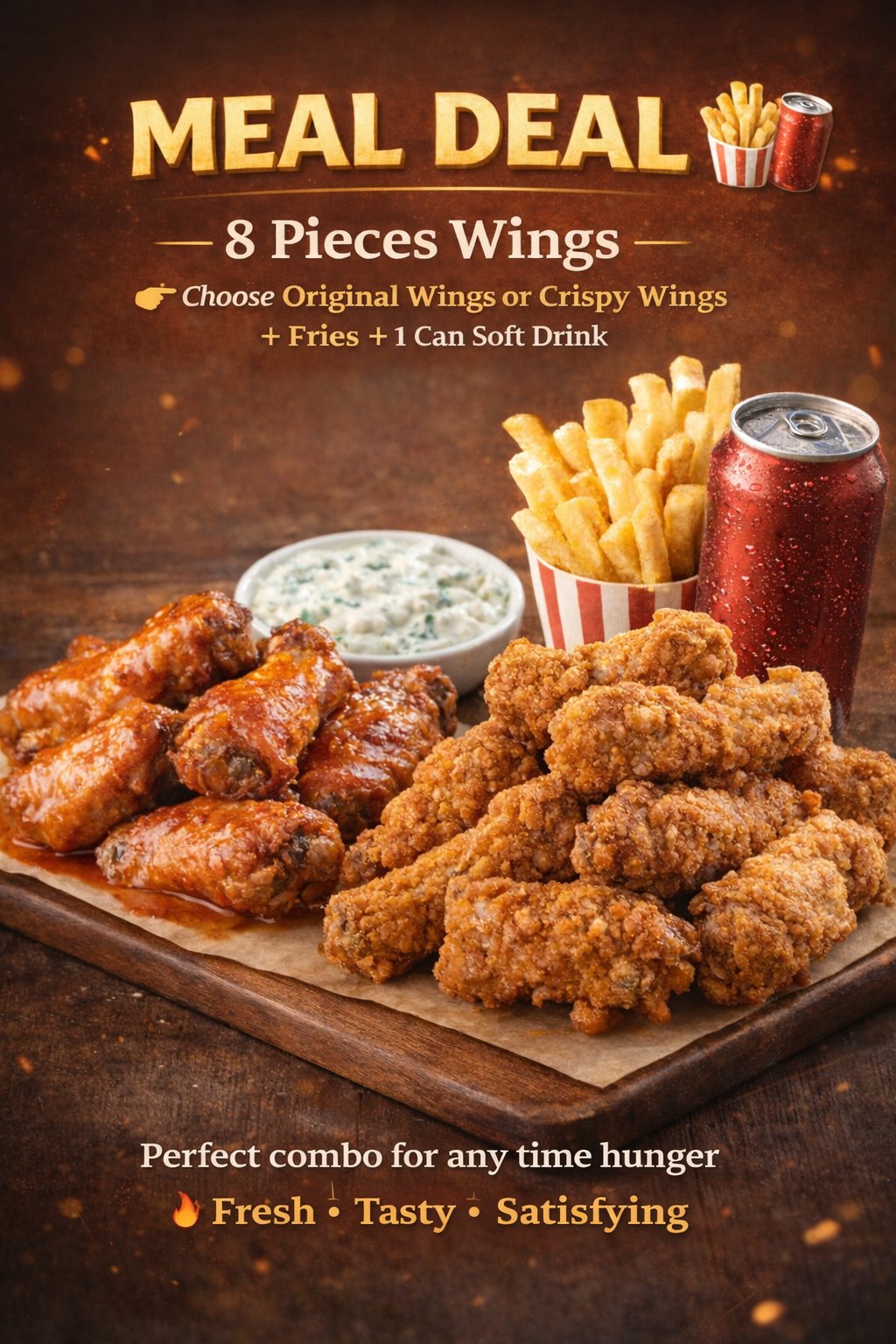 Choose 8 pieces of crispy or original wings, tossed in your favorite sauce. Served with skin-on fries and a soft drink of your choice. Perfectly packed for flavor and crunch!