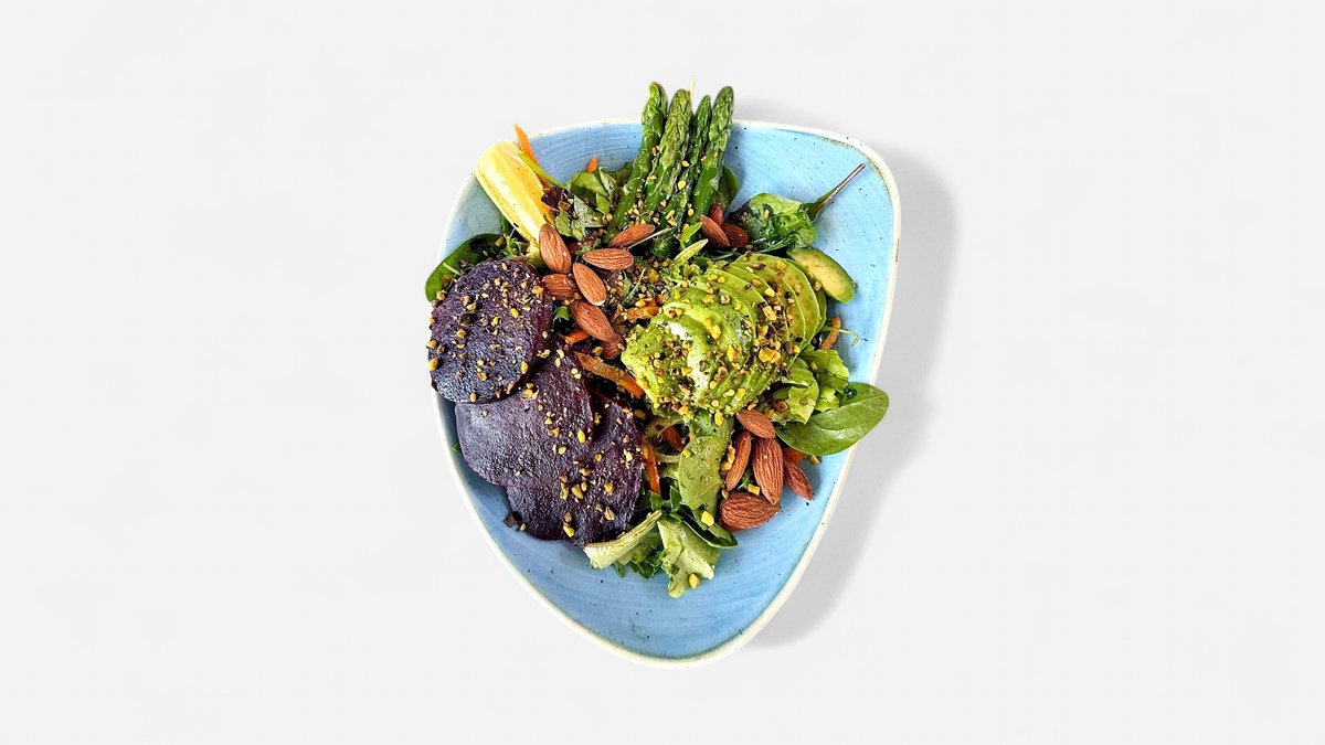 Mixed greens with beetroot, asparagus, avocado, carrots, cherry tomatoes, nuts & lemon dressing.