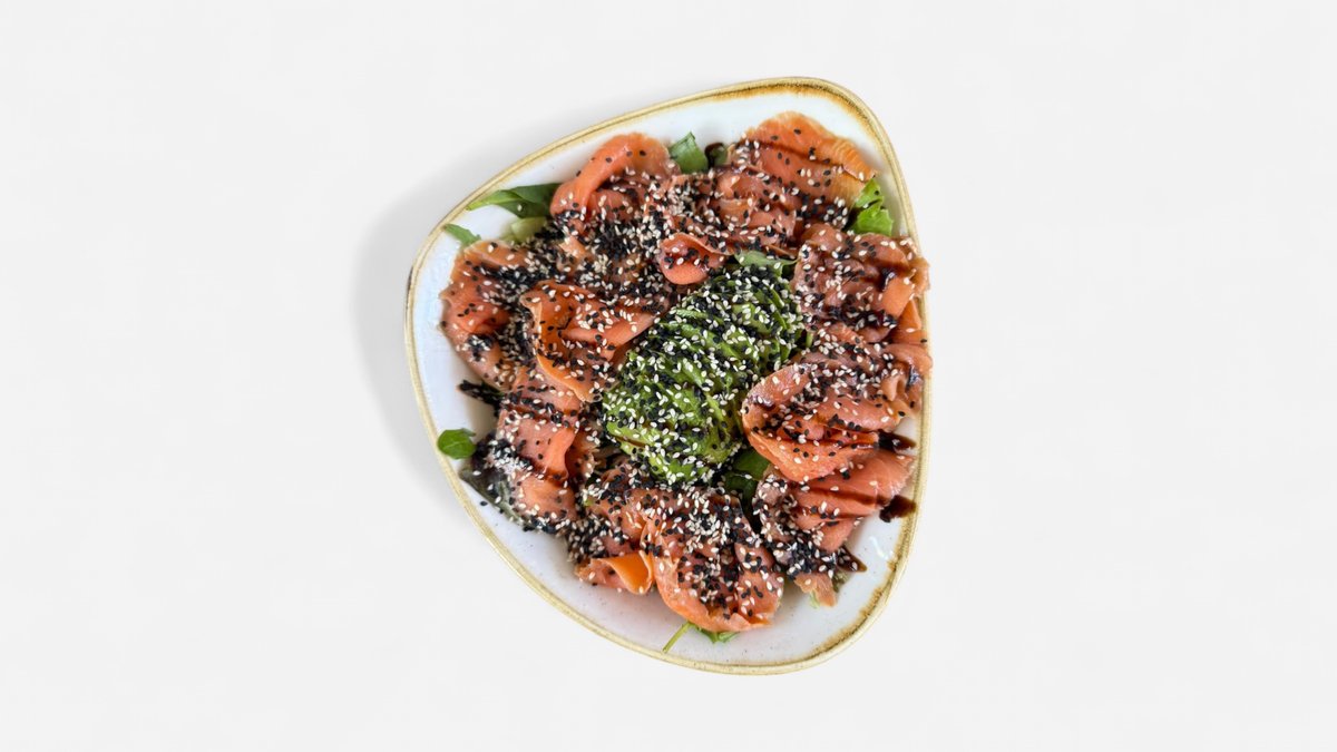 Mixed green with avocado, carrots, onion, cherry tomatoes, kale & smoked salmon. Finished with balsamic vinegar oil & sesame seeds.