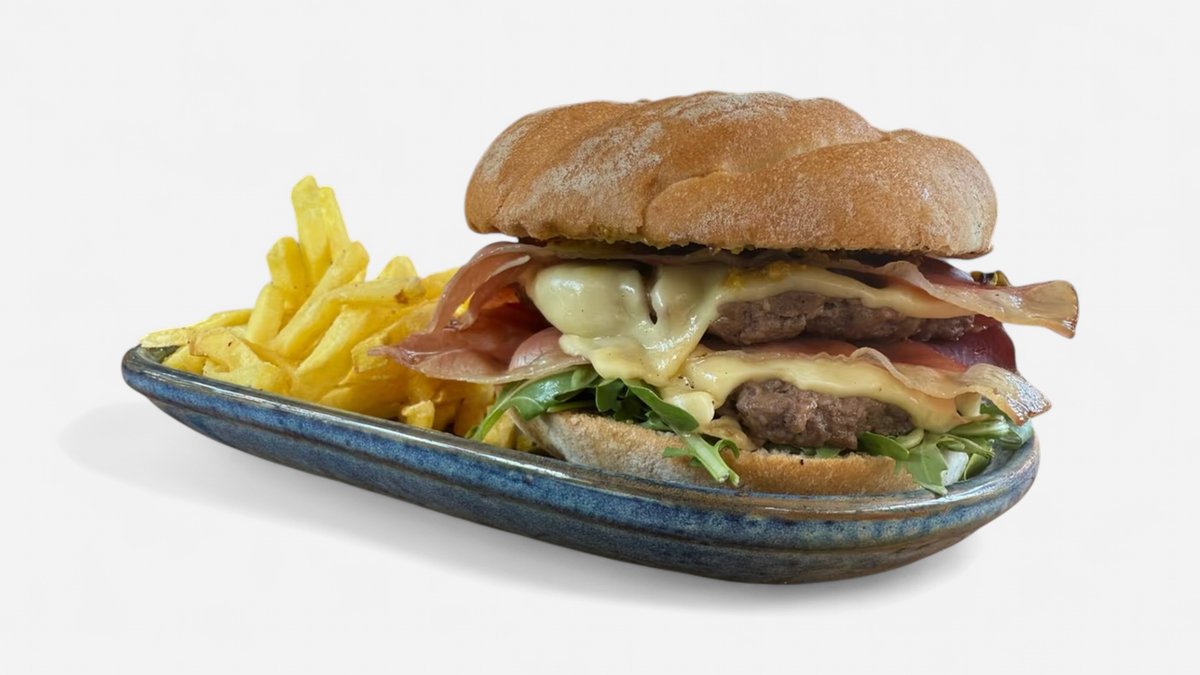 Double beef patty, pistachio cream, melted Emmental cheese, crispy speck, fresh rucola & crushed pistachios.