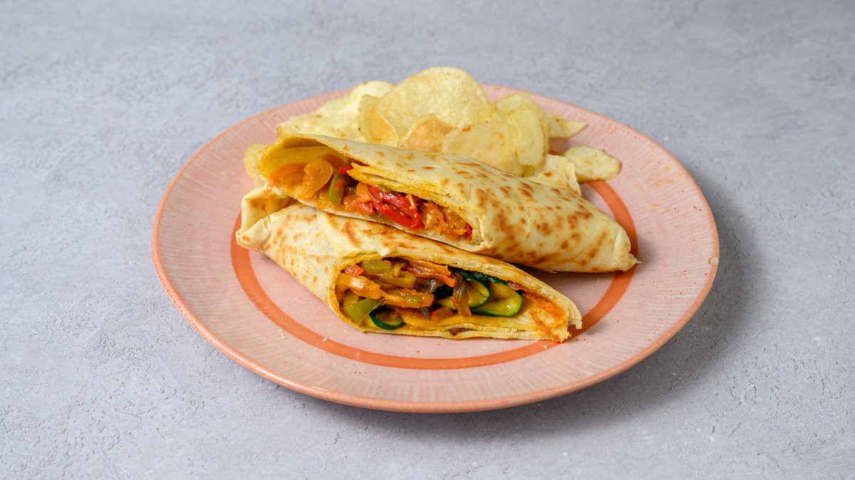 A fresh mix of roasted red peppers, zucchini, walnut paste and crispy onions wrapped in a soft crepe