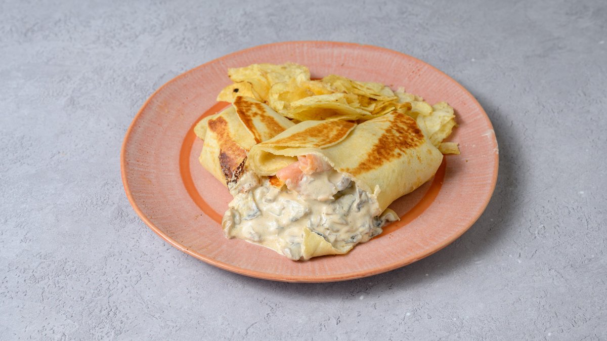 Delicate crepe filled with flaky salmon and a creamy white wine sauce
