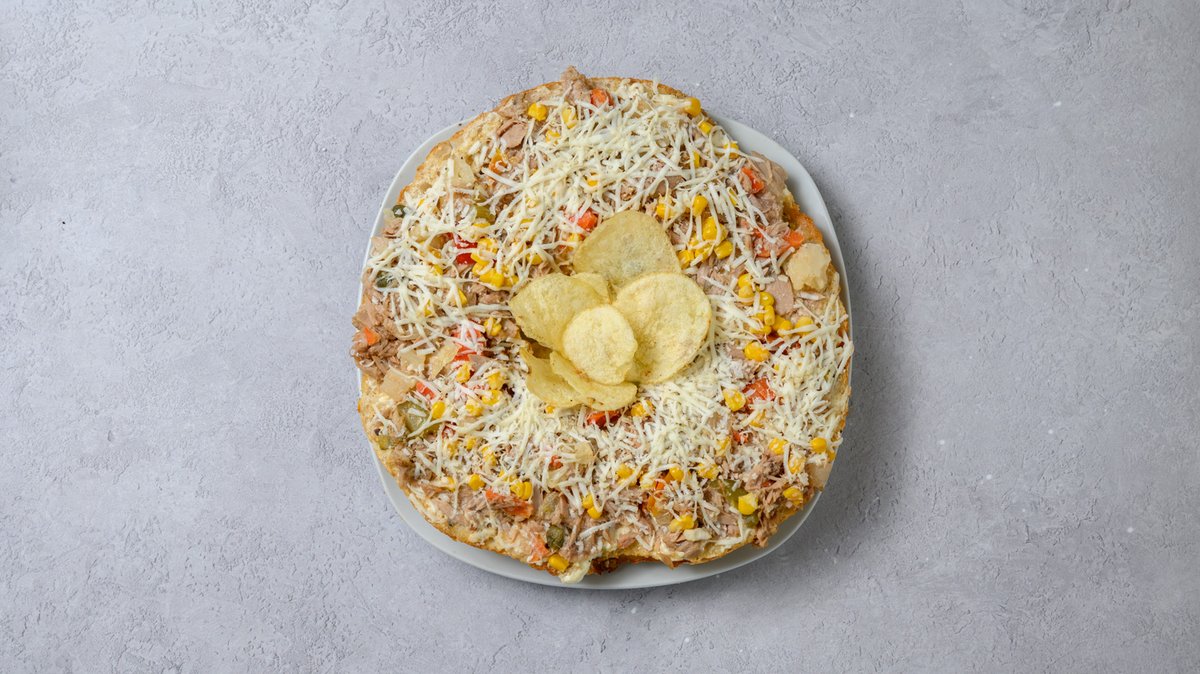 A rich mix of minced pork and beef with onions, sweet corn, peppers, tomato and lettuce-layered with cheddar cheese, sour cream, pico de gallo and a zesty green sauce