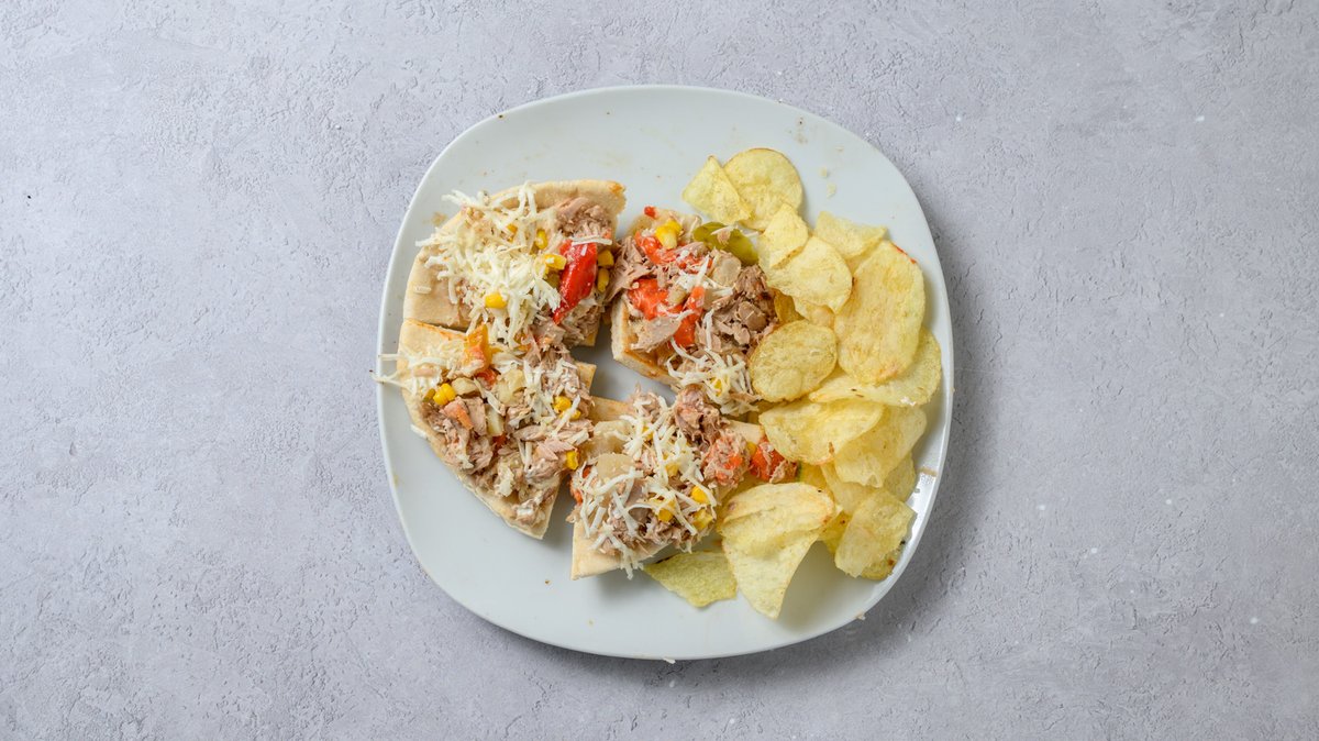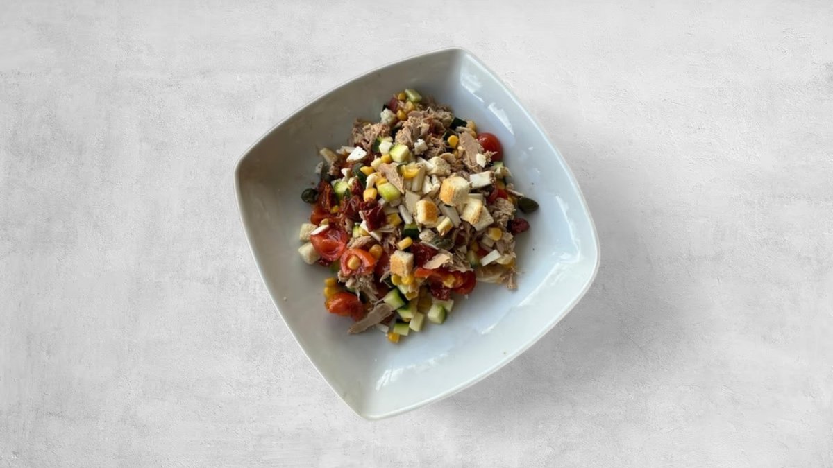 Toasted pita topped with tuna, olives, capers tomato, sun-dried tomato, kunserva, olive oil and ġbejna tal-bzar