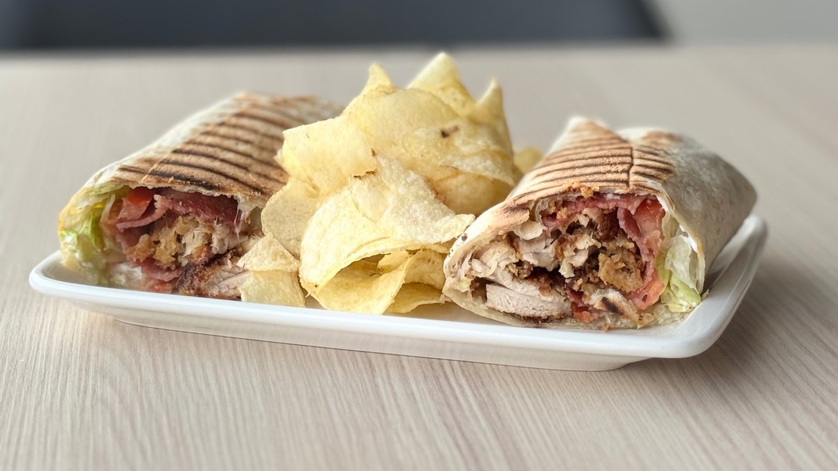 Crispy chicken, crispy bacon, grana padano shavings, fresh tomato, lettuce and creamy mayo-all wrapped up to perfection