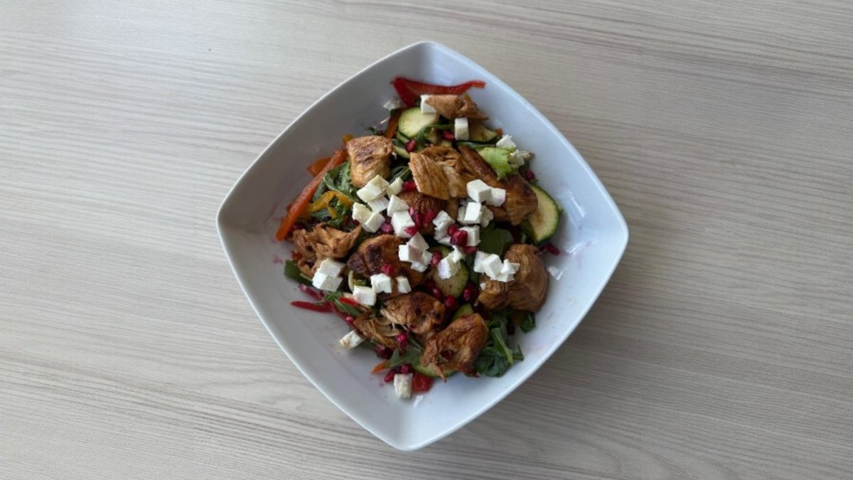 Romaine lettuce, pomegranate, mixed lettuce, peppers, fresh cheese, greek yogurt, honey and zucchini