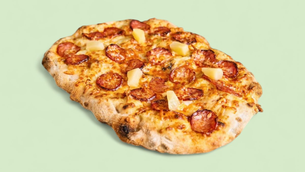 En spennende kombinasjon av krydret pepperoni og søt ananas på en base av vår kremete, hjemmelagde hvite pizzasaus. Toppet med smeltet ost som gir en perfekt balansert smaksopplevelse – både spicy og søt! Størrelse: 30×25 cm. Perfekt for én person.