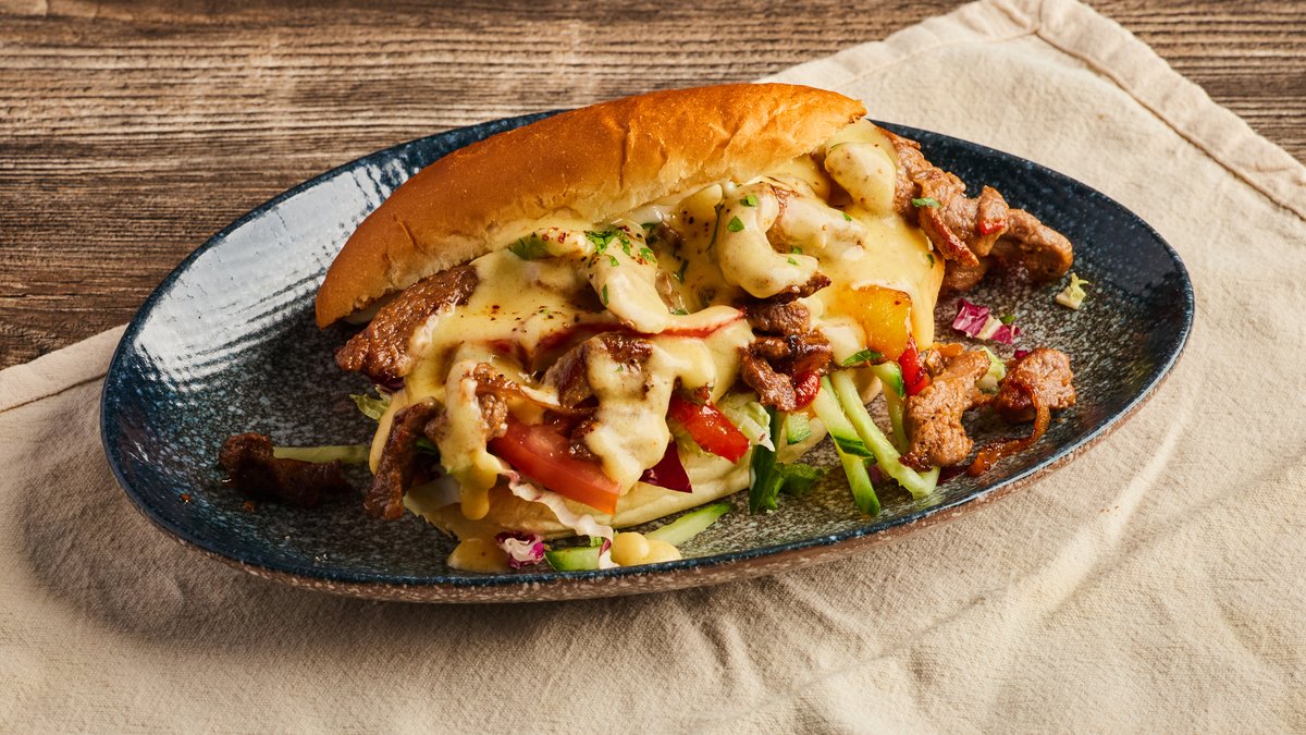 Marinerte biffstrimler, løk, paprika, aioli, salat, tomat og agurk i et saftig brioche brød. Toppes med ostesaus.