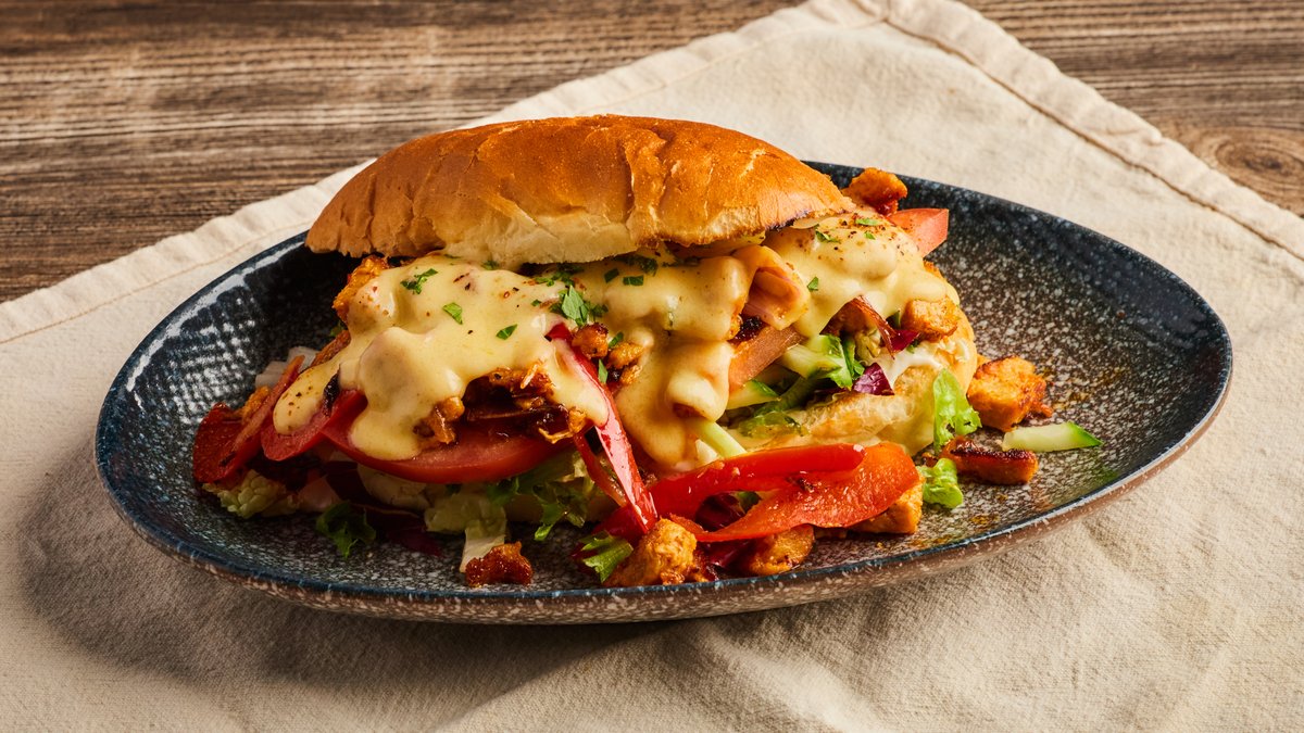 Krydret vegetar chunks, løk, paprika, aioli, salat, tomat og agurk i et saftig brioche brød. Toppes med ostesaus.