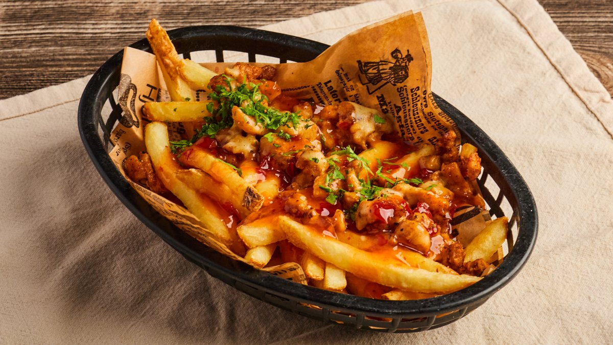 Pommes frites med pulled pork, BBQ-saus, syltet rødløk og varm ostesaus.