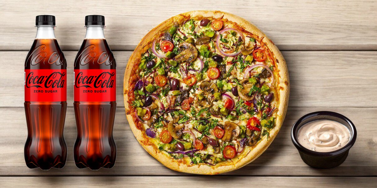 1 x Stor pizza, 1x Dressing, 2 x 0.5l brus