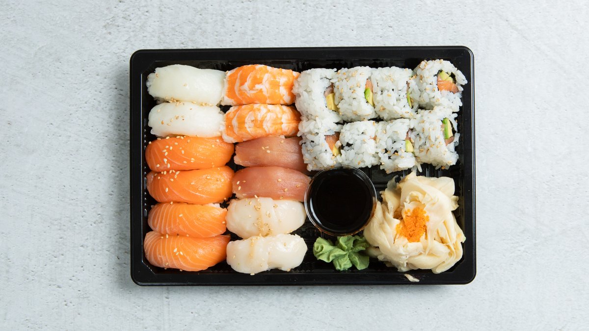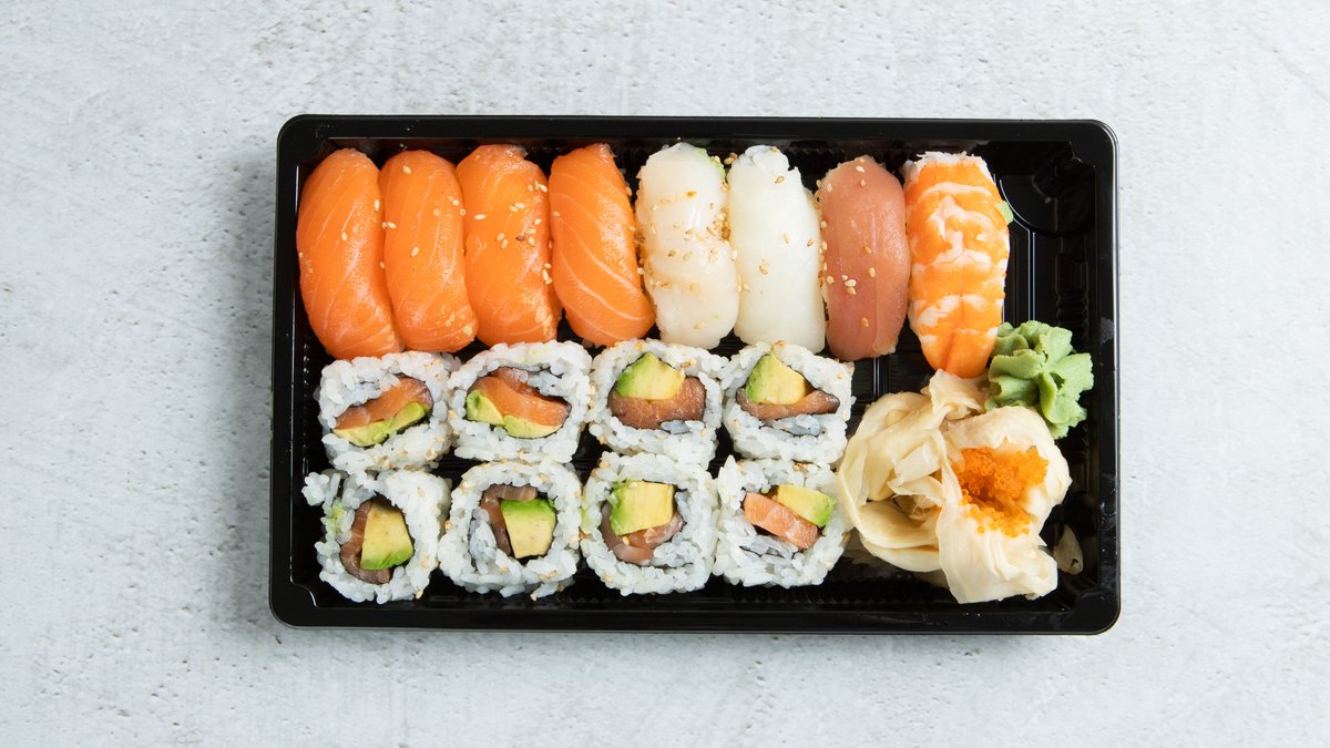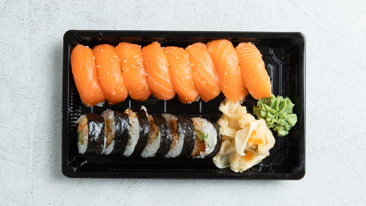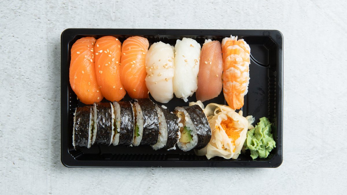 6 laks, 2 kveite, 2 tunfisk, 2 scampi, 2 kamskjell, 12 tempura futo maki.