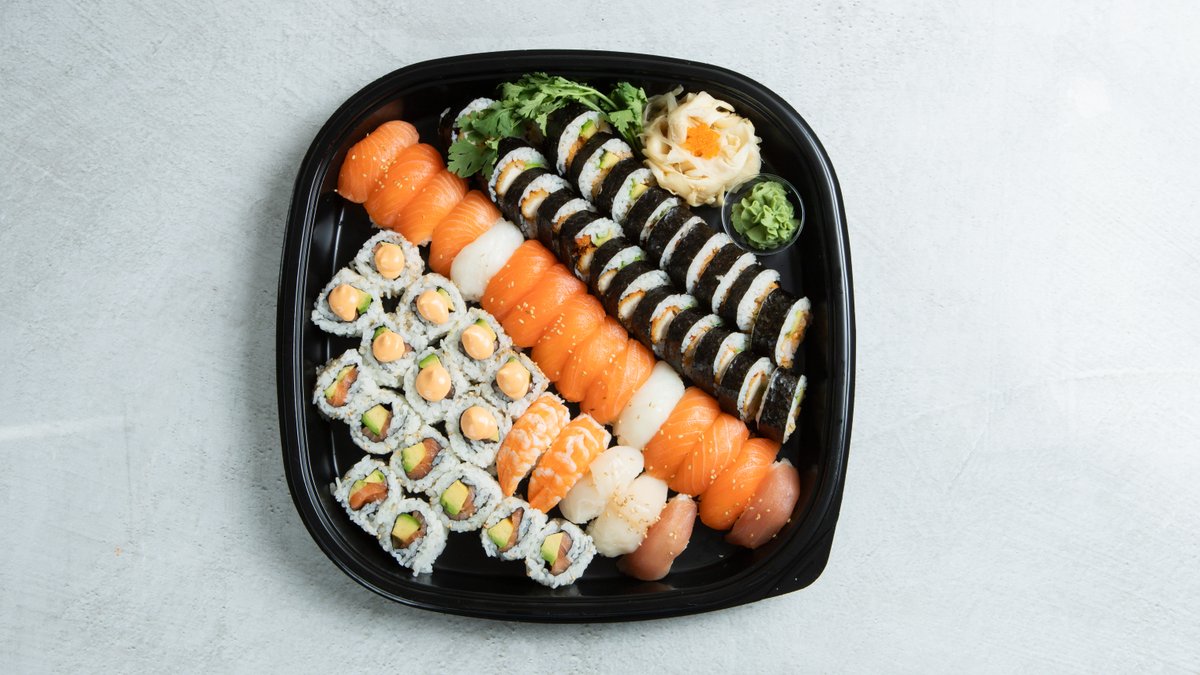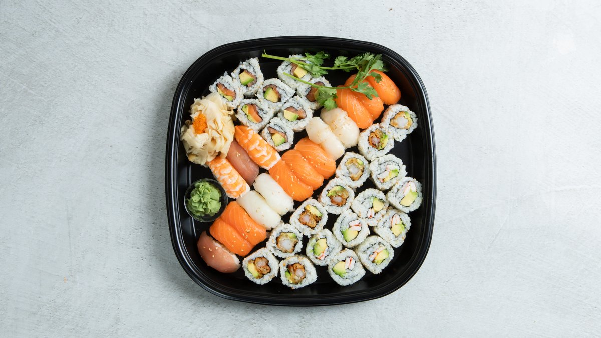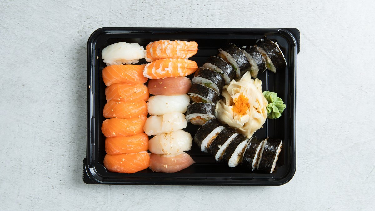20 nigiri: 12 laks, 2 kveite, 2 tunfisk, 2 scampi, 2 kamskjell. 40 Maki: 12 tempura futo maki, 12 crispy chicken maki, 8 biter spicy laks (laks, avokado og chilimajones), 8 biter laks maki.