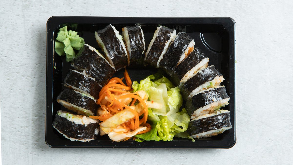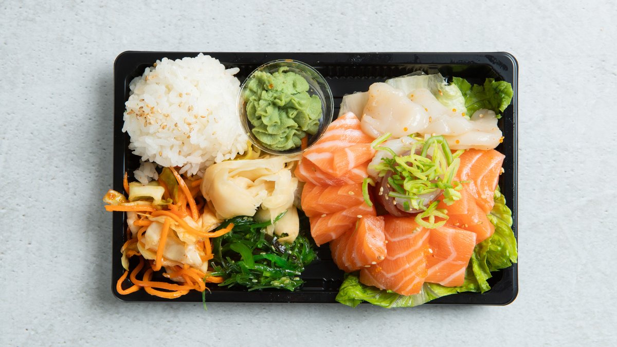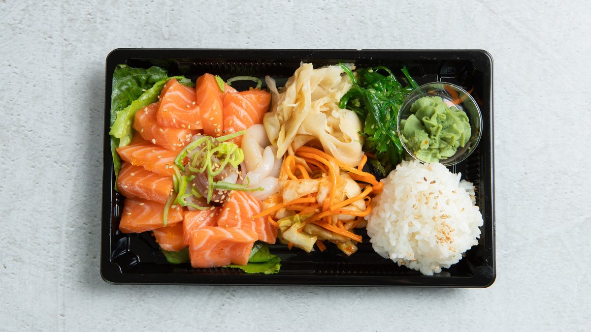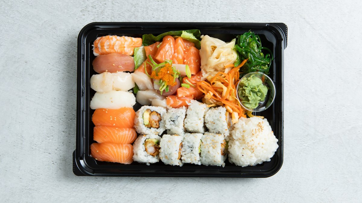7 nigiri: 3 laks, kveite, tuna, scampi, kamskjell. 13 sashimi: 7 laks, 2 kveite, 2 tunfisk, 2 kamskjell (sashimi-toppet med purre), 8 biter tempura maki. Medfølger sushi ris, wakame, kimchi og ponzusaus.