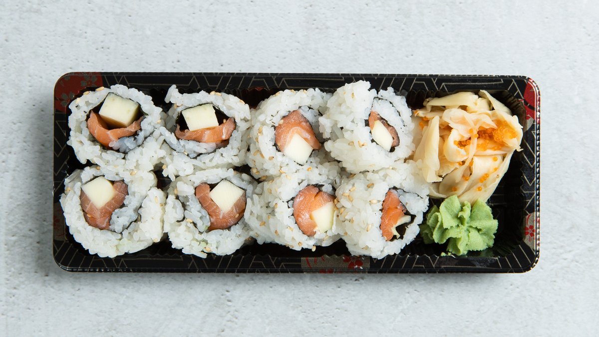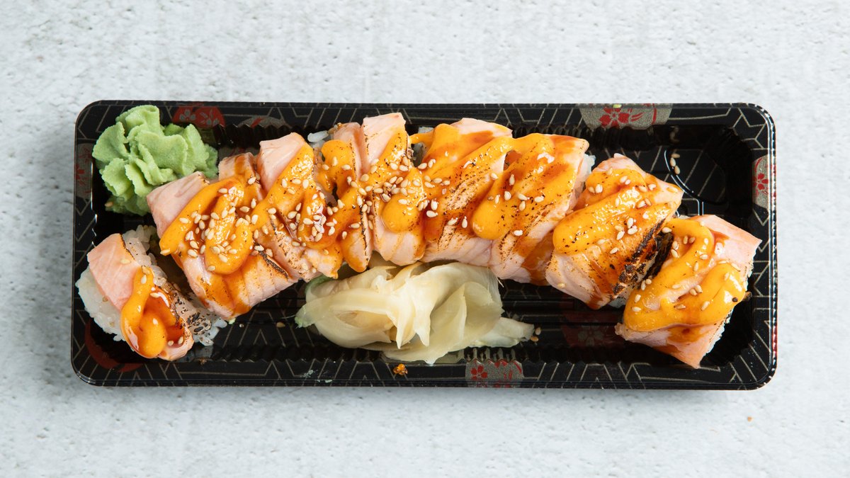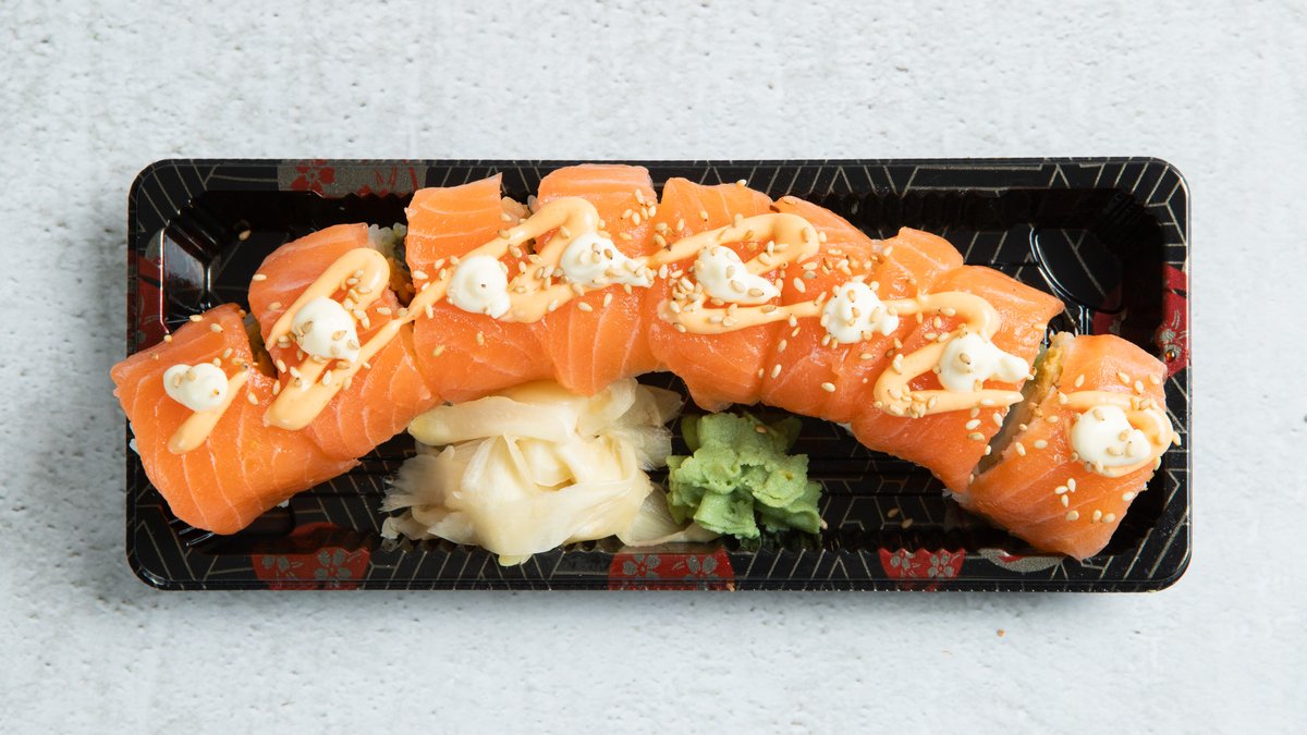 Innabkt laks, philadelphia, purreløk, chilimajones, teriyakisaus, sesamfrø. Serveres med ponzusaus.