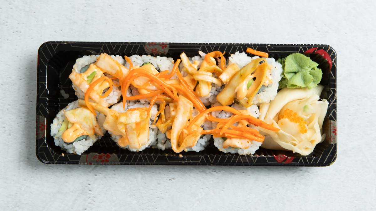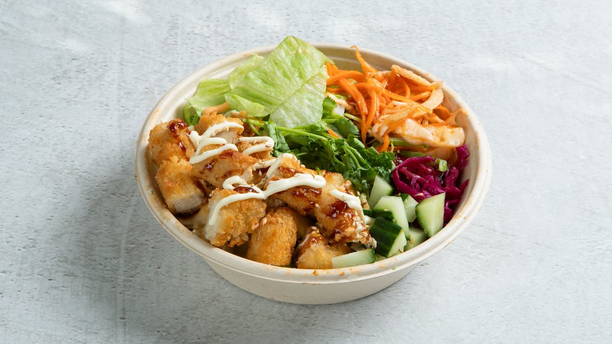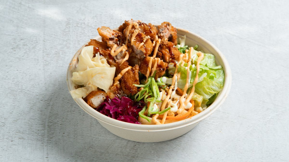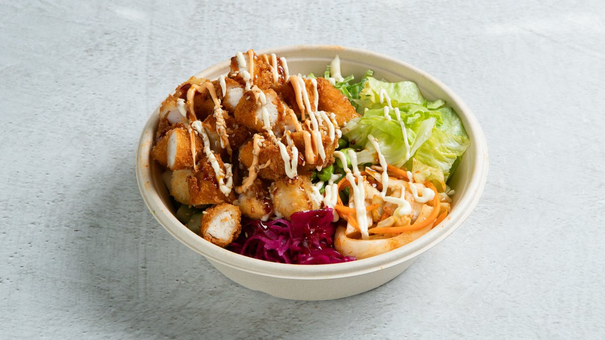 Fritert kylling, ingefær, salat, mango, avokado, edamame, kimchi, vinaigreitte hodekål, soya, chilimayo, teriyaki saus og sushi ris.