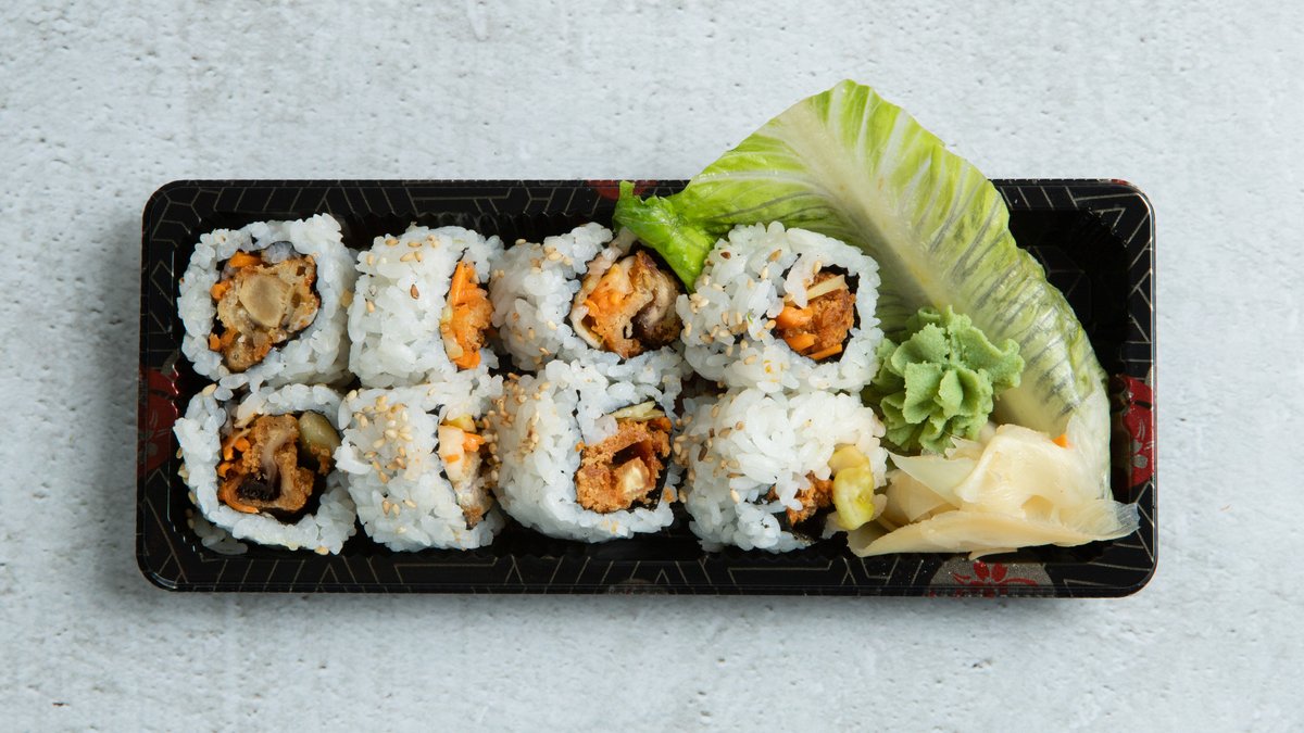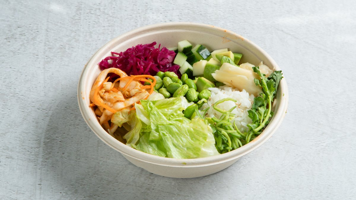 Fritert tofu, ingefær, salat, mango, avokado, edamame, kimchi, vinaigreitte hodekål, soya, chilimayo, teriyaki saus og sushi ris.