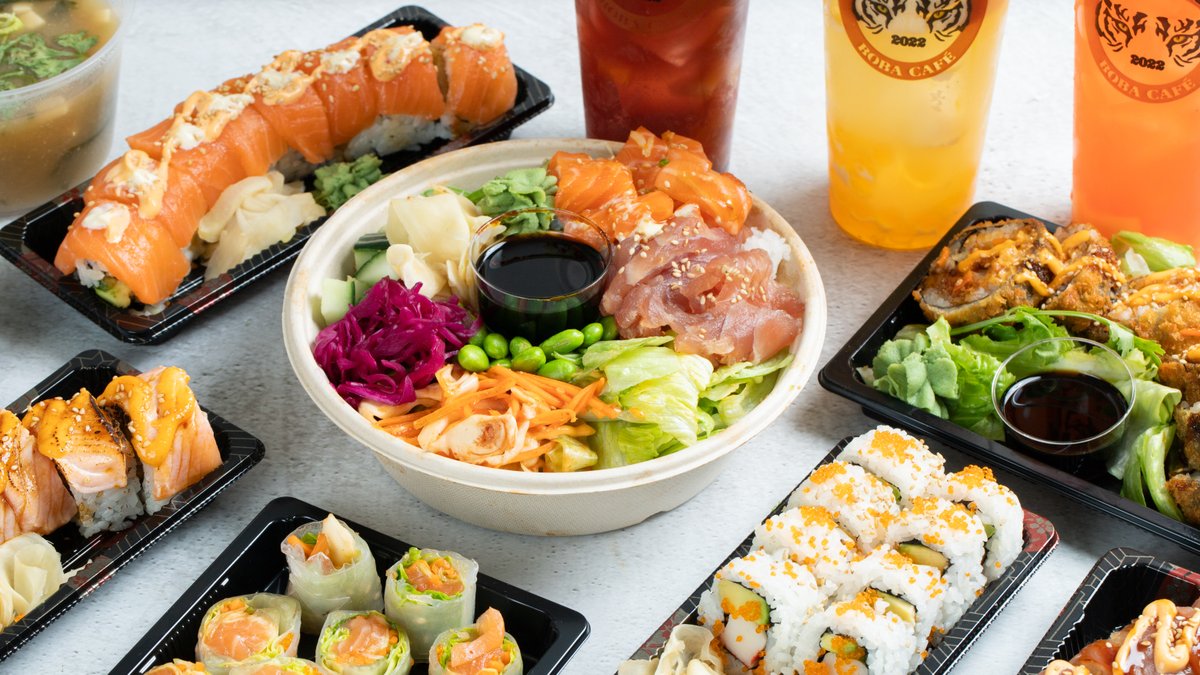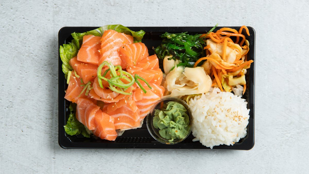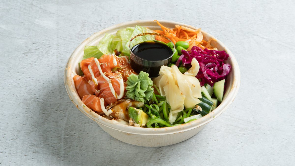 Fersk laks, ingefær, salat, mango, avokado, edamame, kimchi, vinaigreitte hodekål, soya, chilimayo, teriyaki saus og sushi ris.