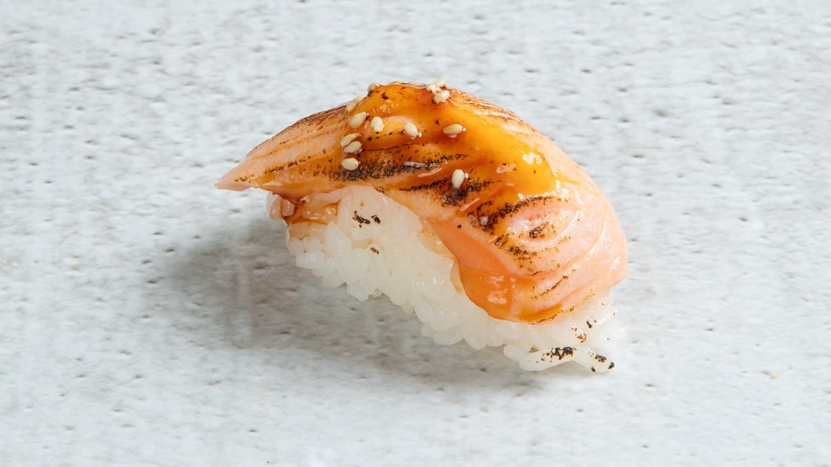 Fritert scampi, avokado, toppet med flambert laks med teryakisaus, chilimajones og sesamfrø.