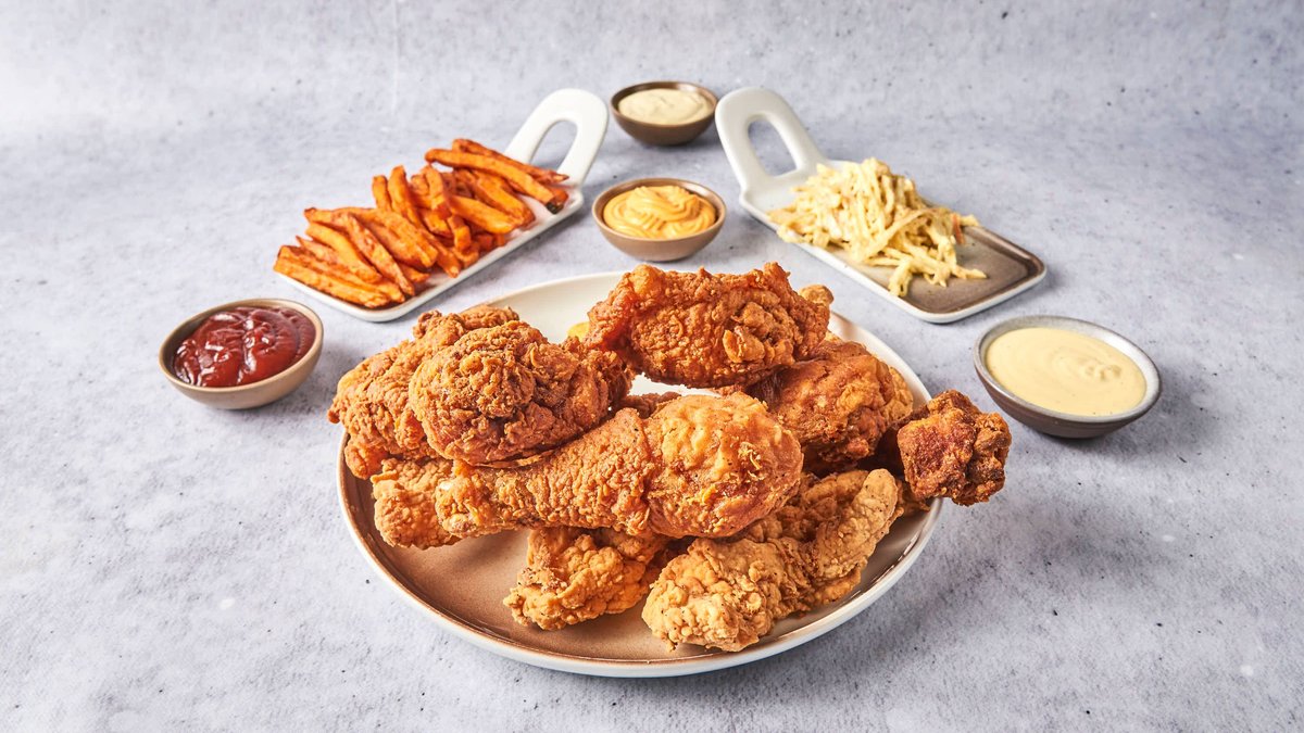2 hele kyllinger + 3 sideretter + 6 sauser. Velg mellom Slo-Bro eller Spicy Cajun.
