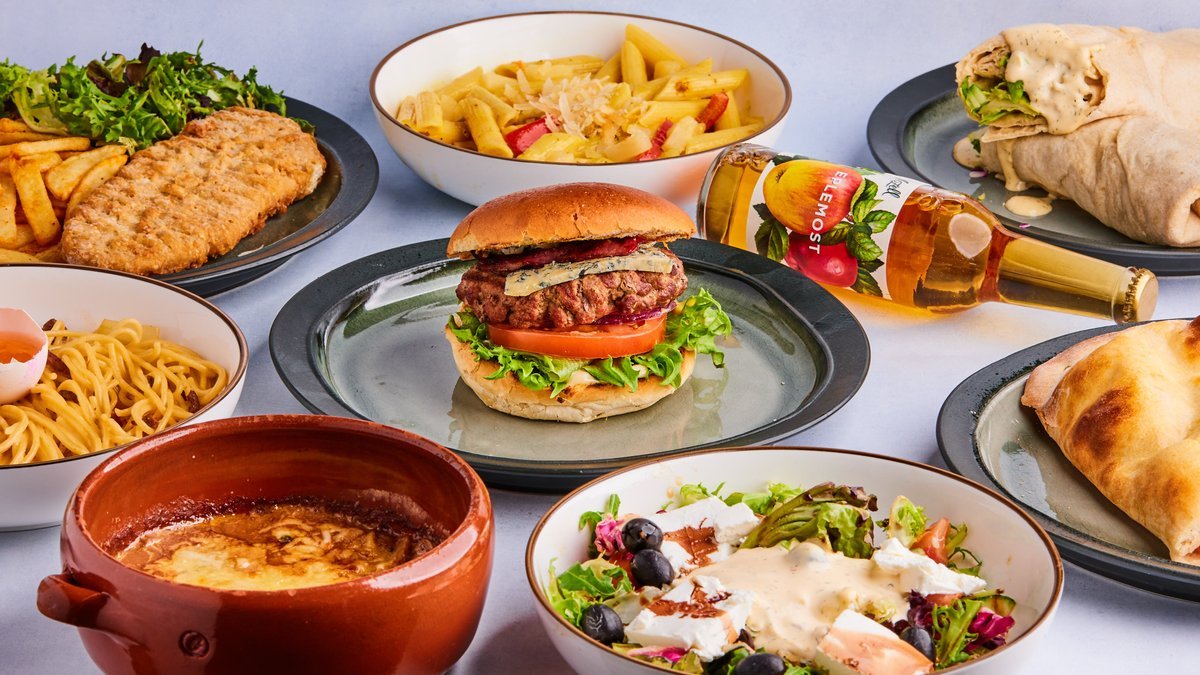 Biffsnadder med paprika, champignon, salat, béarnaisesaus og pommes frites.