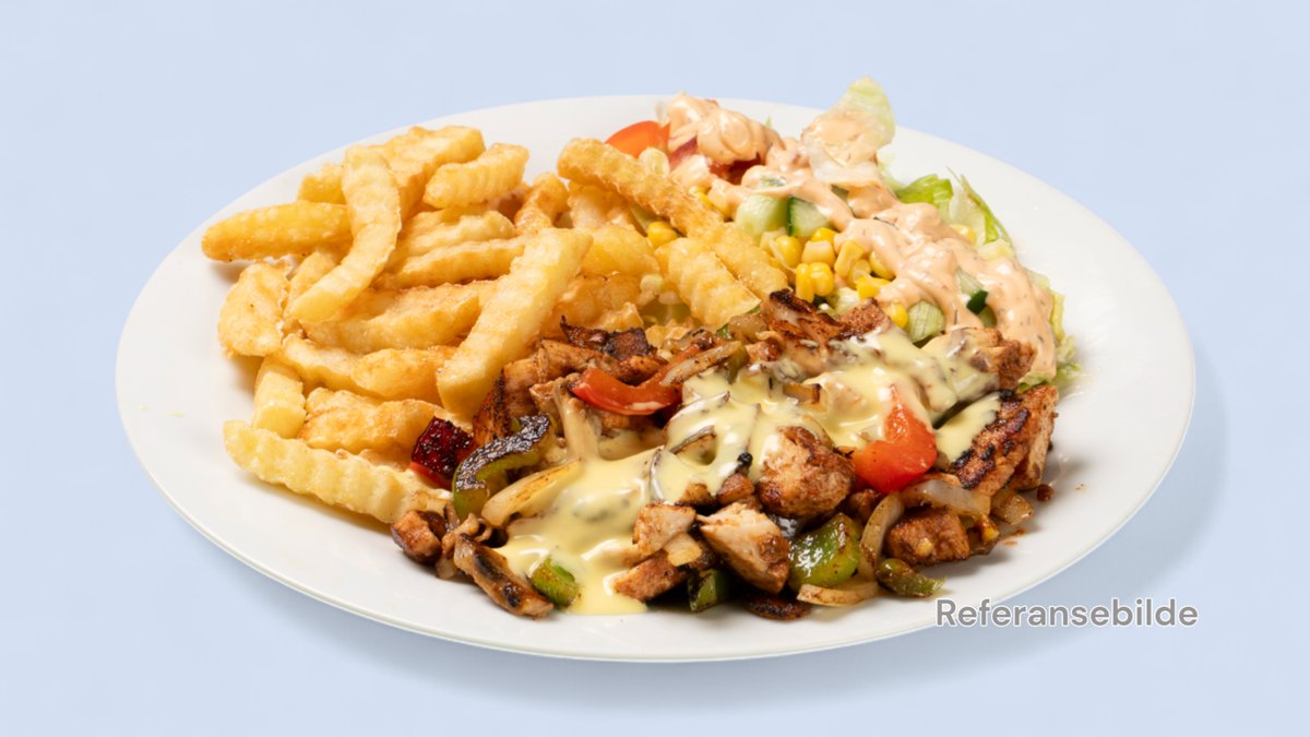 Marinert kyllingstrimmler, paprika og løk. Velg mellom pommes frites eller salat.