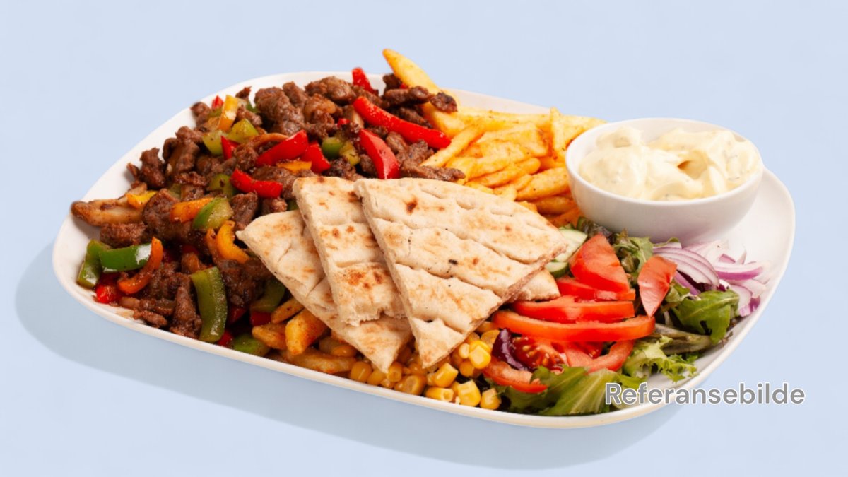 Isbergsalat, kebab, pommes frites, kebabsaus, tomat, mais, agurk, løk .