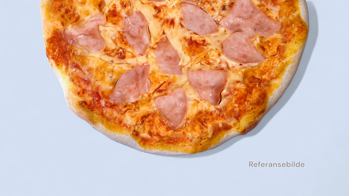 Tomatsaus, ost, skinke og sjampinjong. Velg Størrelse.