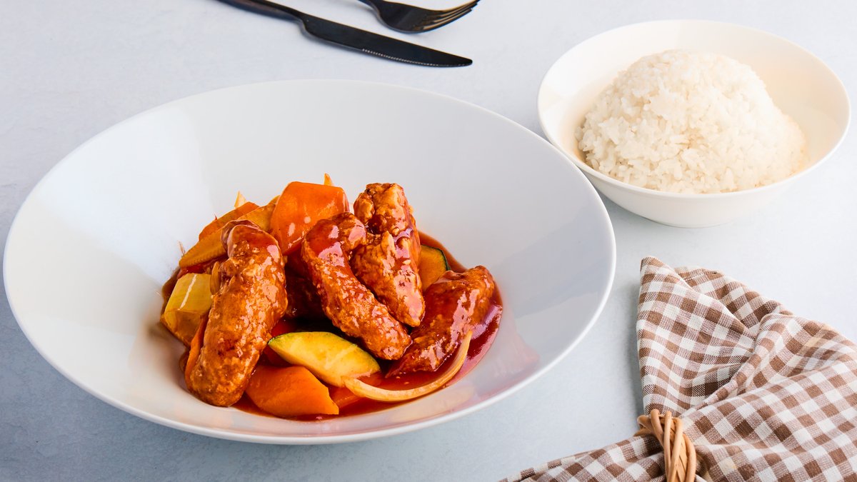 Innbakt svin / kylling i sursøt saus på ekte kantonesisk vis.