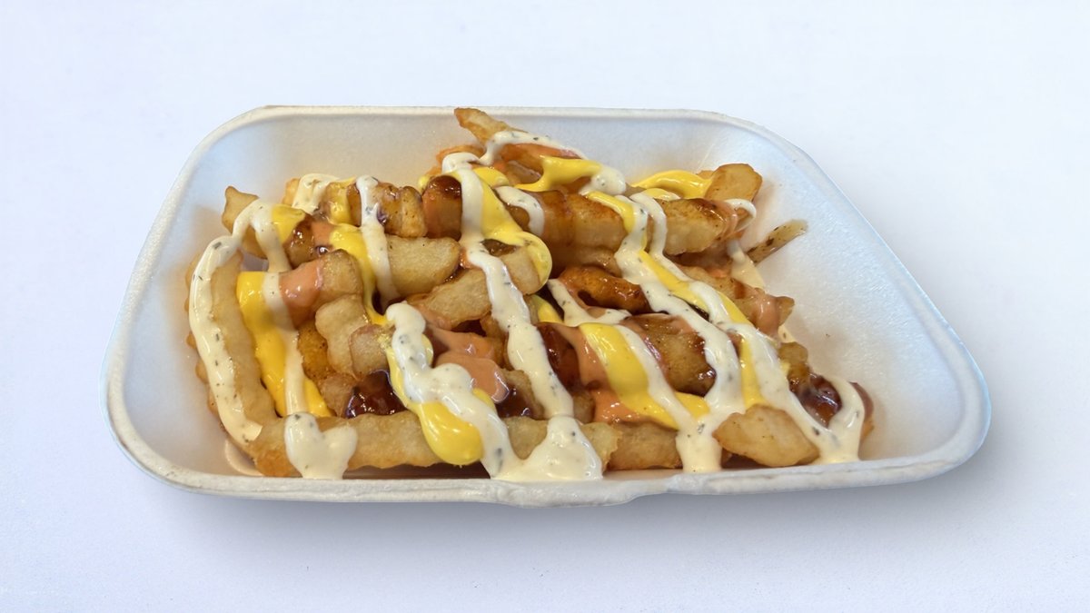 Pommes frites med salat, mais, saus og dressinger. Serveres i rull. Velg styrke på dressing.