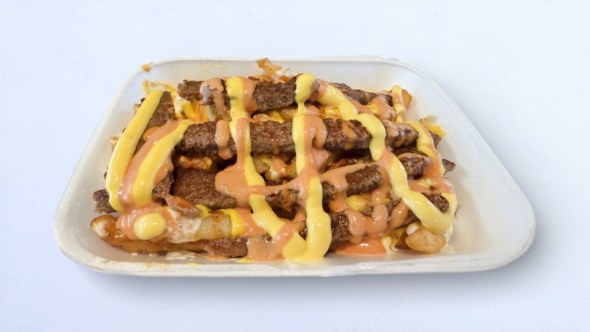Inneholder kebabkjøtt, mais, salat, dressing og pommes frites.