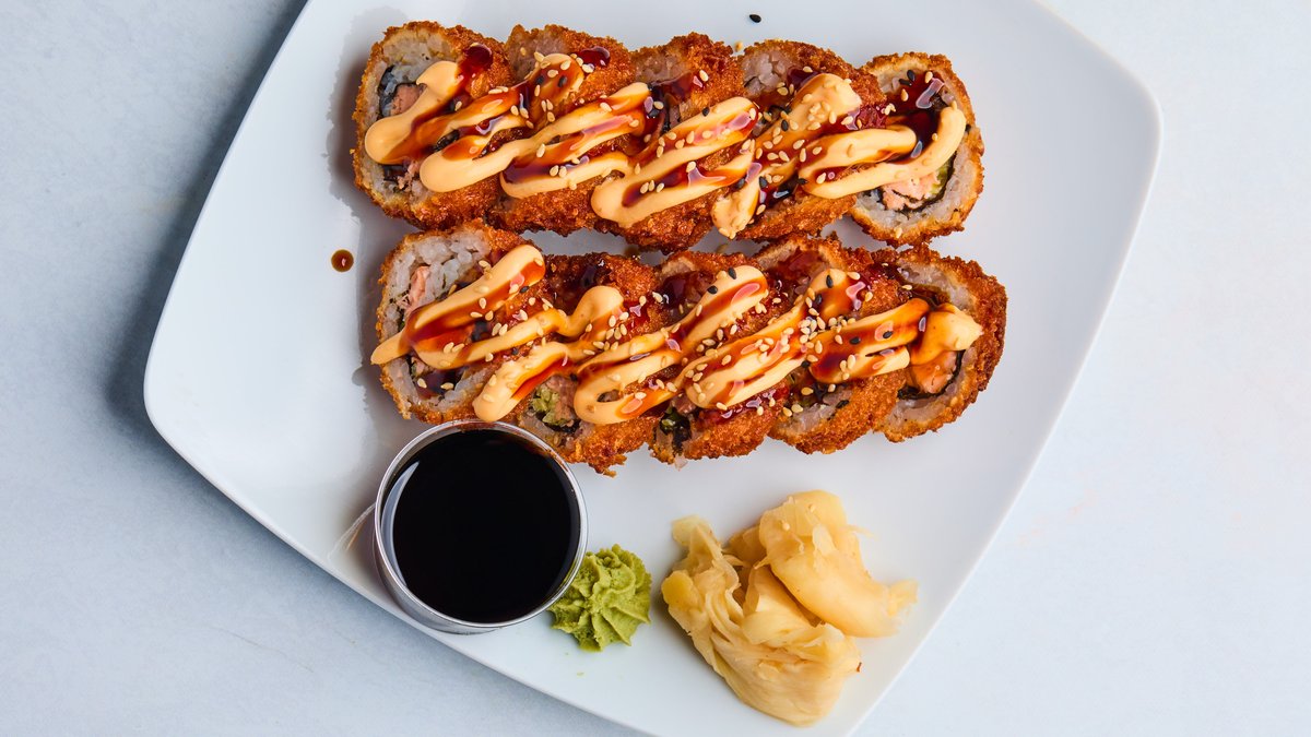 Fritert laks, avokado, chilimajones og sesamfrø.