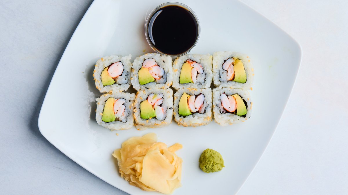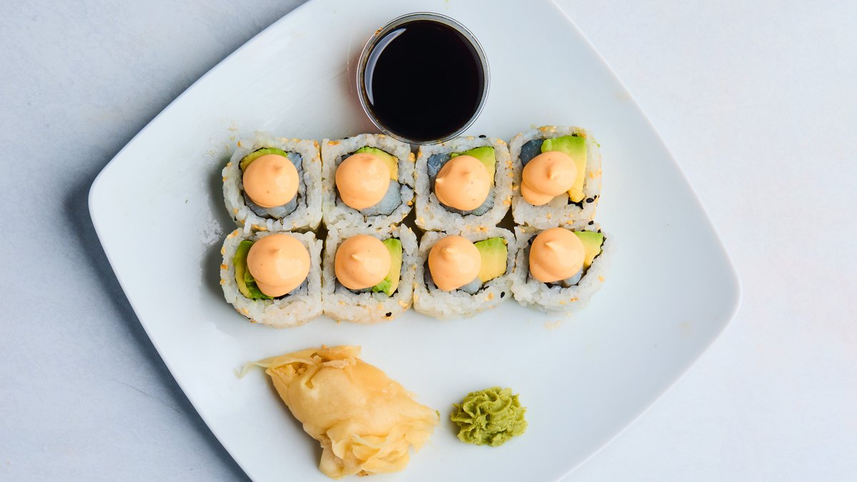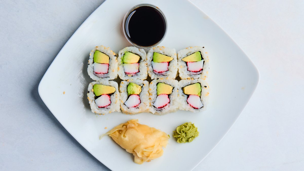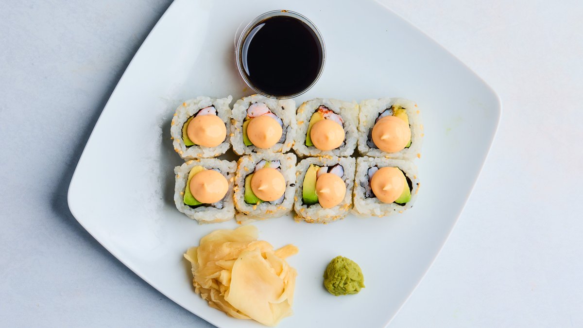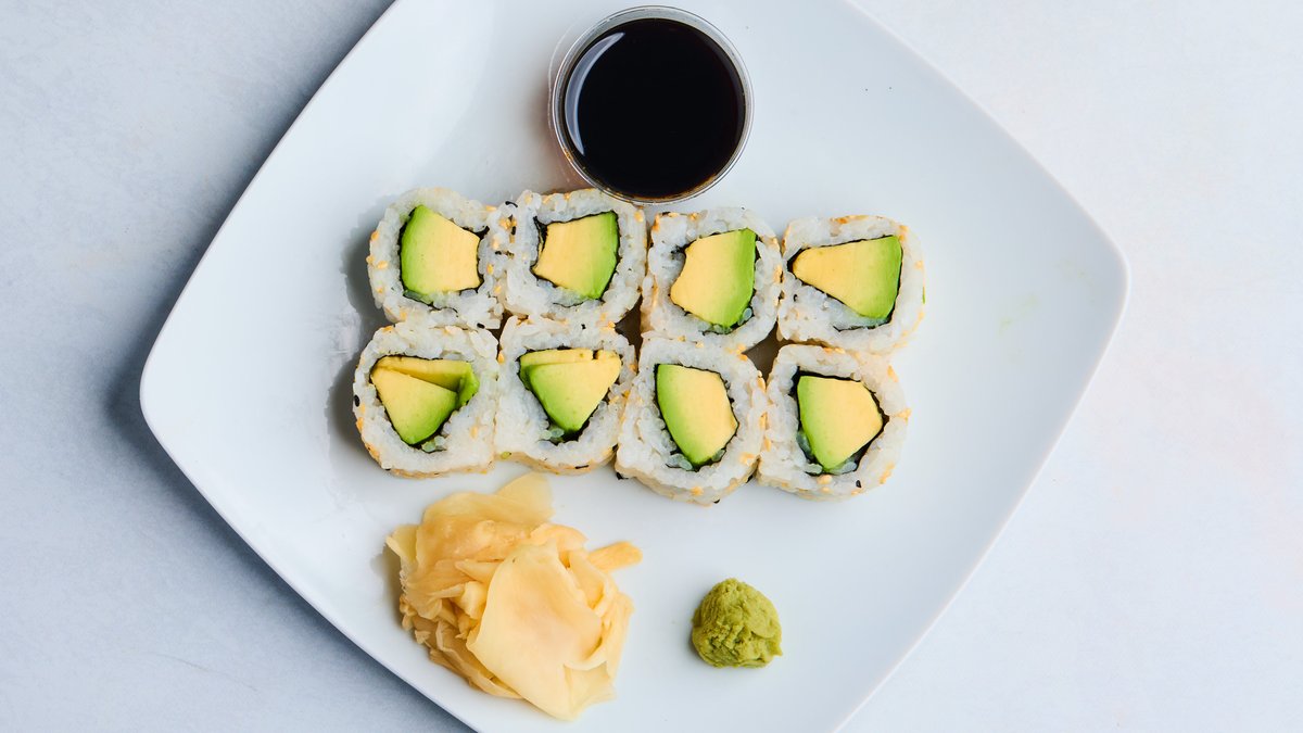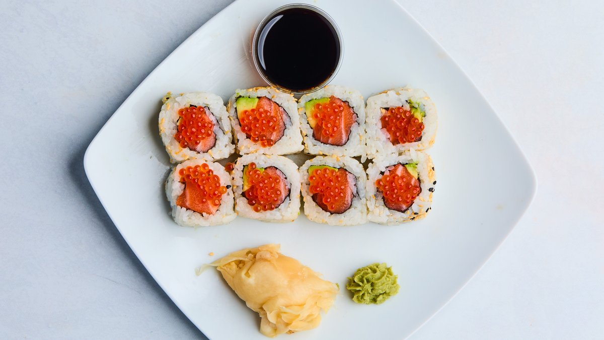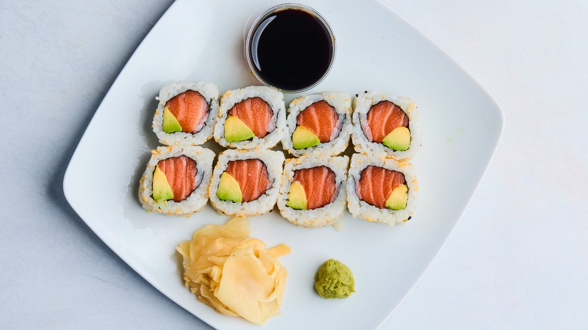 Rullet avokado toppet med laks, tunfisk, kveite og kamskjell.