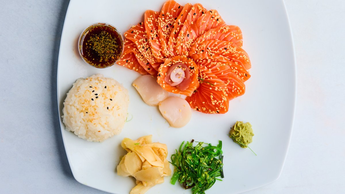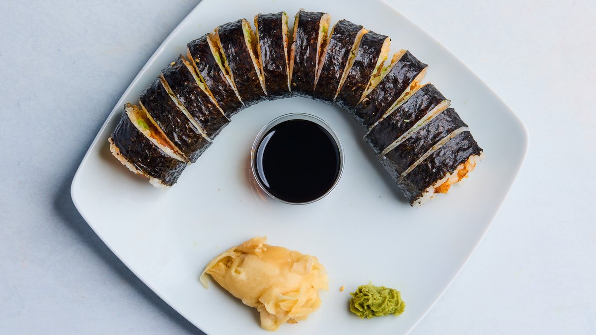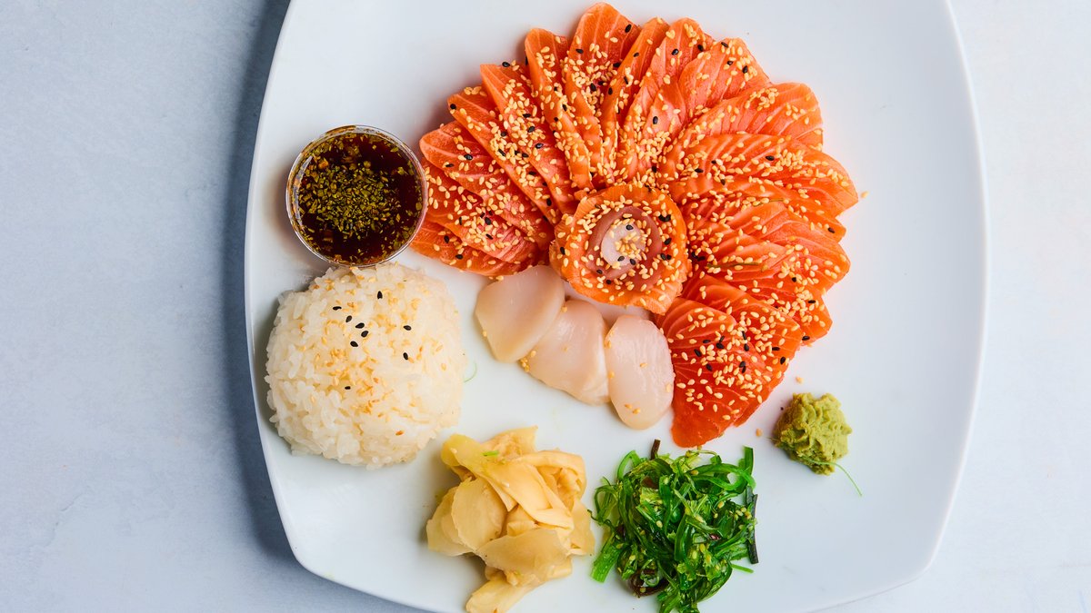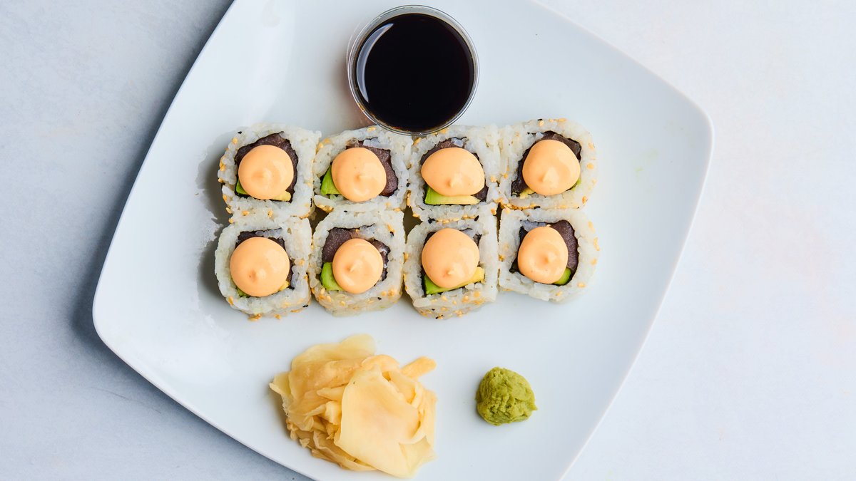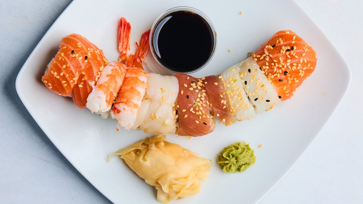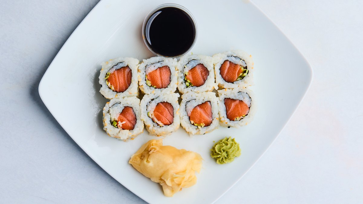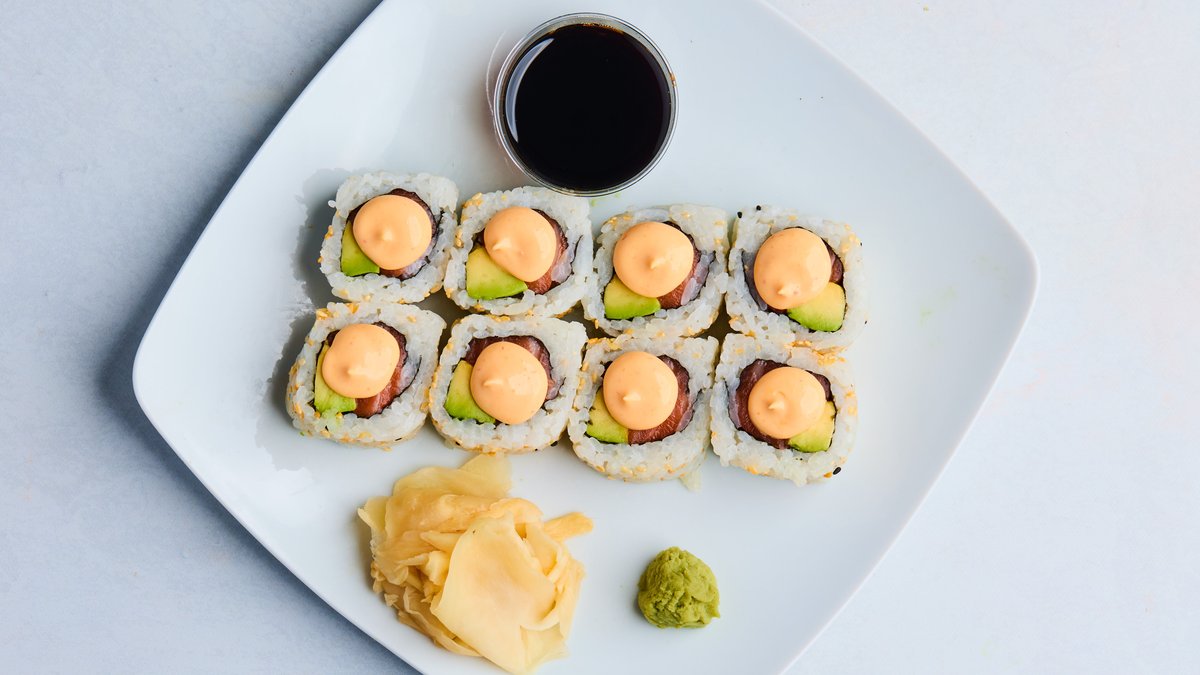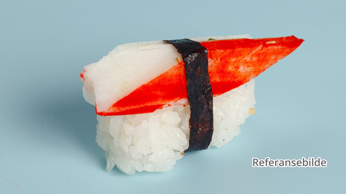Rullet avokado toppet med laks, tunfisk, kveite og kamskjell.