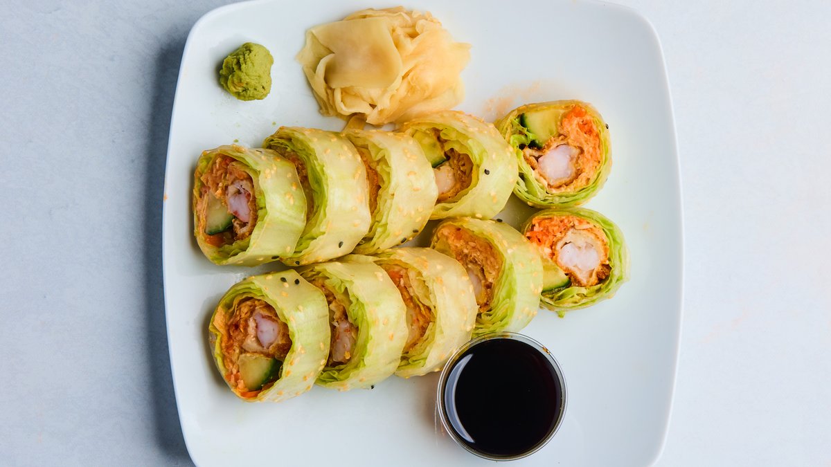 Softshell krabbe, salat, agurk, gulrot, ingefær og chilimajones.