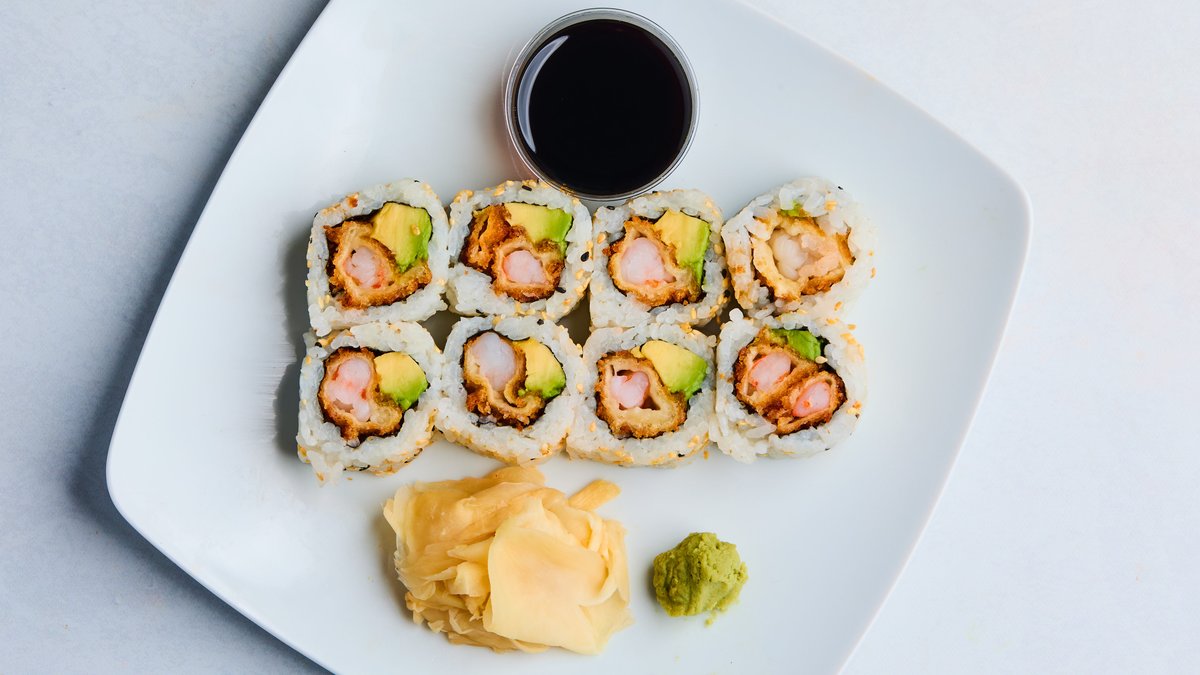 Med scampi, philadelphia, avokado, chilimayo og teriyakisaus.